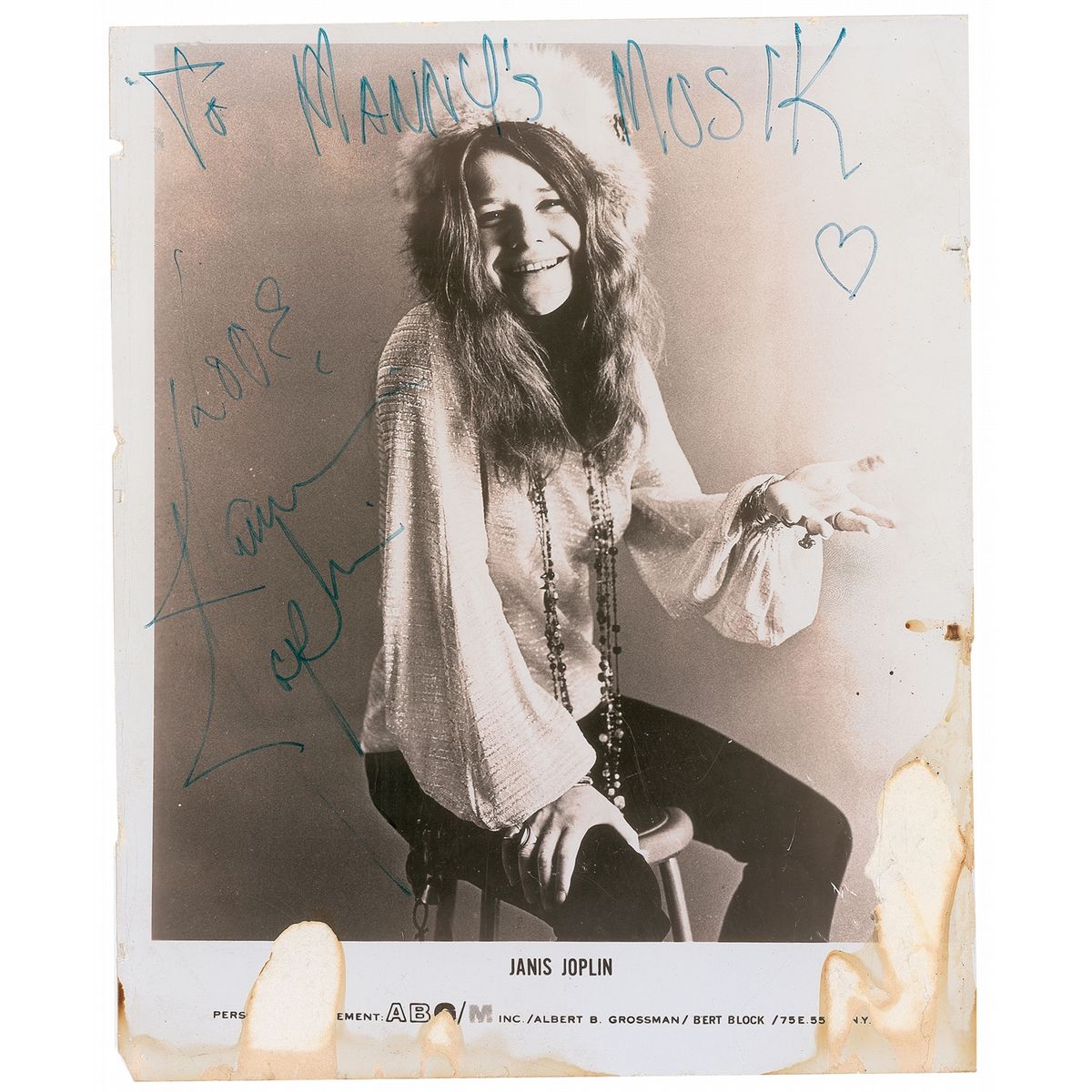Incredibly scarce glossy 8 x 10 publicity photo of Joplin seated on a stool, signed and inscribed in blue felt tip, “To Manny’s Musik, Love, Janis Joplin,” adding a small heart. Areas of surface loss and moderate toning to lower portion of photo, binder dings to left edge, a few spots to background, and some scattered light surface marks and creases, otherwise very good condition. Manny’s Music in Times Square was a must-stop destination for many musicians over the decades, including the Beatles, Rolling Stones, Bob Dylan, Bob Marley, and Joplin. Signed photos of this size are very seldom encountered, this being only the third we have ever offered, with the example offered here having great association with a New York music landmark.
