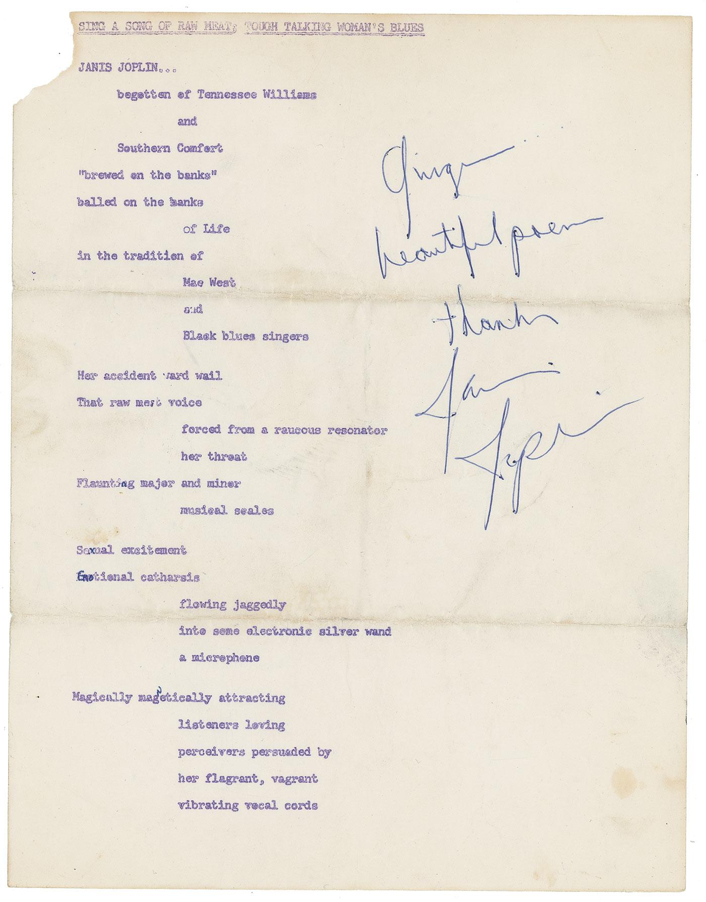 Mimeographed free-verse poem by fan Ginger Wilson, titled “Sing A Song of Raw Meat: Tough Talking Woman’s Blues,” six pages, 8.5 x 11, signed and inscribed in ballpoint on the first page, “Ginger, beautiful poem, Thanks, Janis Joplin.” The poem begins: “Janis Joplin…begotten of Tennessee Williams and Southern Comfort, ‘brewed on the banks,’ balled on the banks of Life, in the tradition of Mae West and Black blues singers…. Her accident ward wail, that raw meat voice forced from a raucous resonator, her threat flaunting major and minor musical scales…. Sexual excitement, emotional catharsis flowing jaggedly into some electronic silver wand, a microphone….” In very good condition, with intersecting folds (associated light soiling), mild toning, wrinkling, and rust stains or small loss to upper left corner of each sheet. Joplin’s writing is bold and dark.