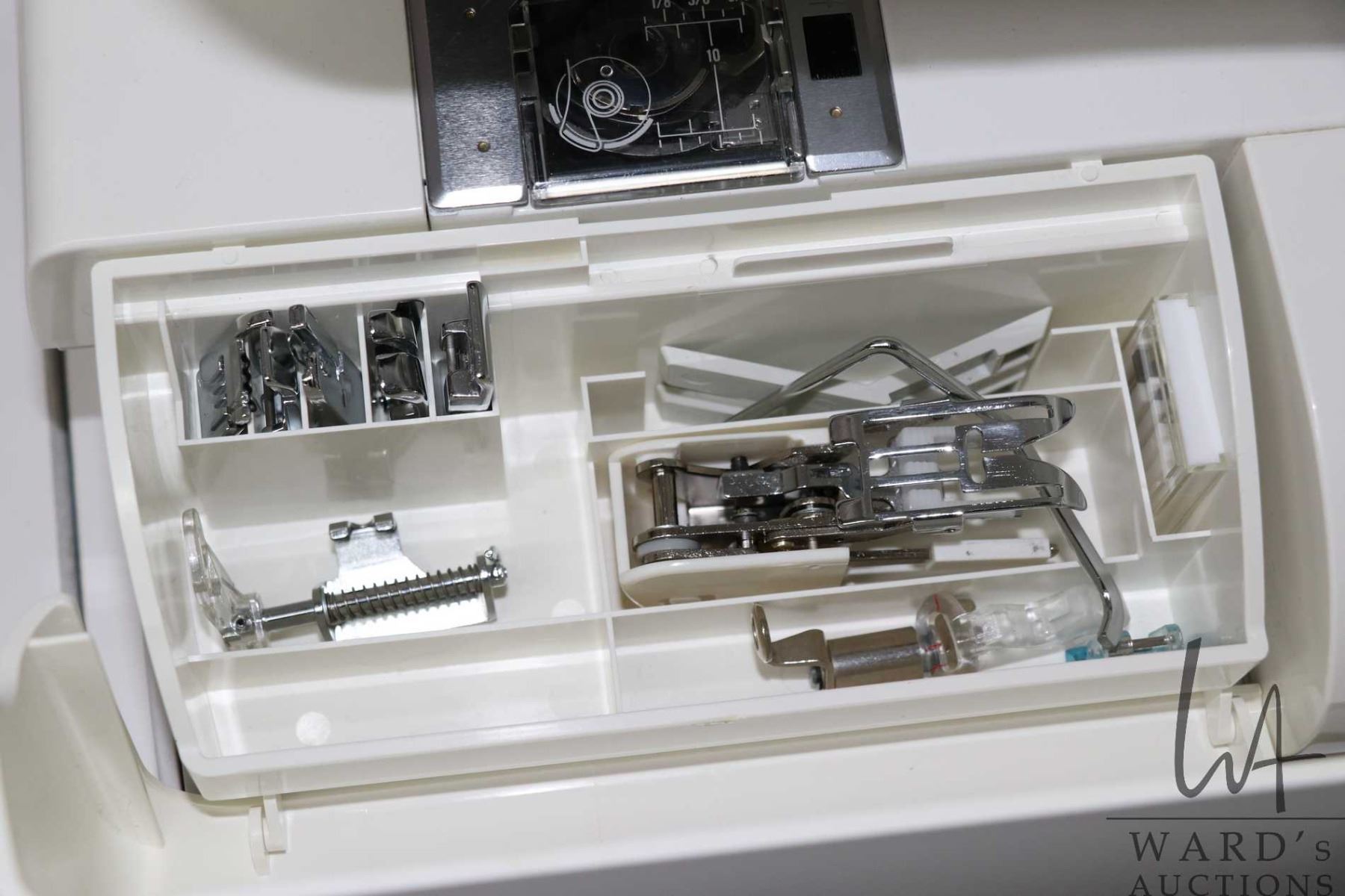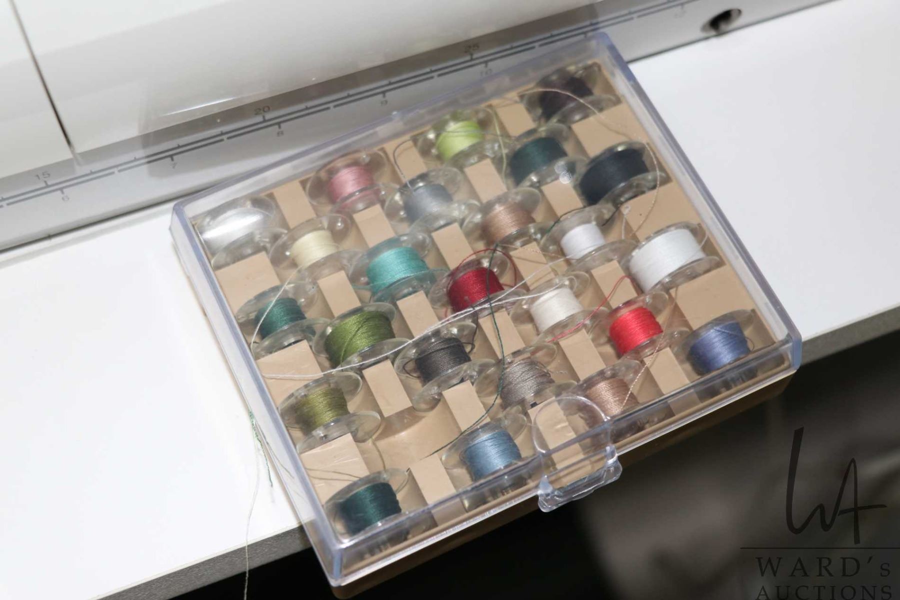 Janome Memory Craft 9000 embroidery/ sewing machine, includes portable case, one hoop, instruction book, knee kick, memory card, extra feet and accessories, presser foot and power cord plus a selection of bobbins and sewing accessories. Appears to be working at time of cataloguing