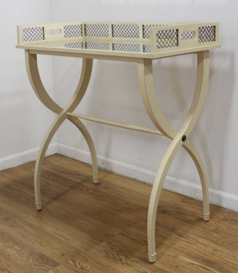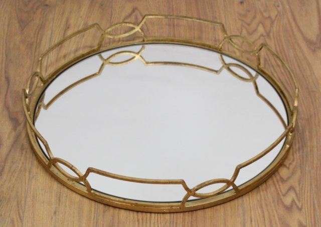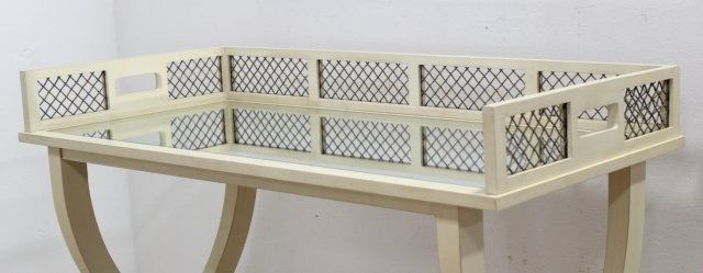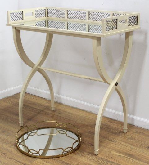 With mirrored removable top. Brass grillwork. Plus gilt metal mirrored serving tray. Table approx. 39" H x 37" W x 19" D. Tray approx. 20" diameter.