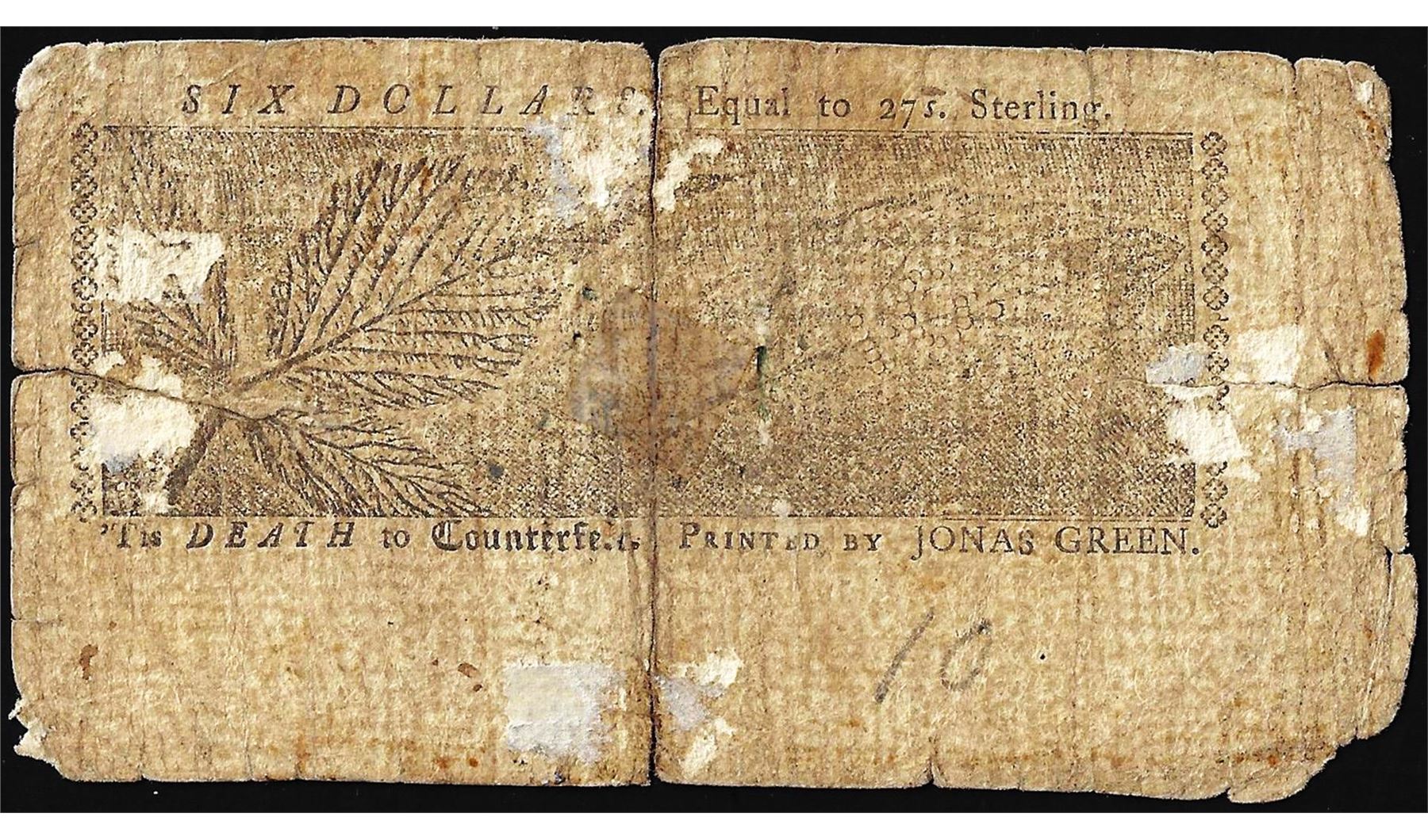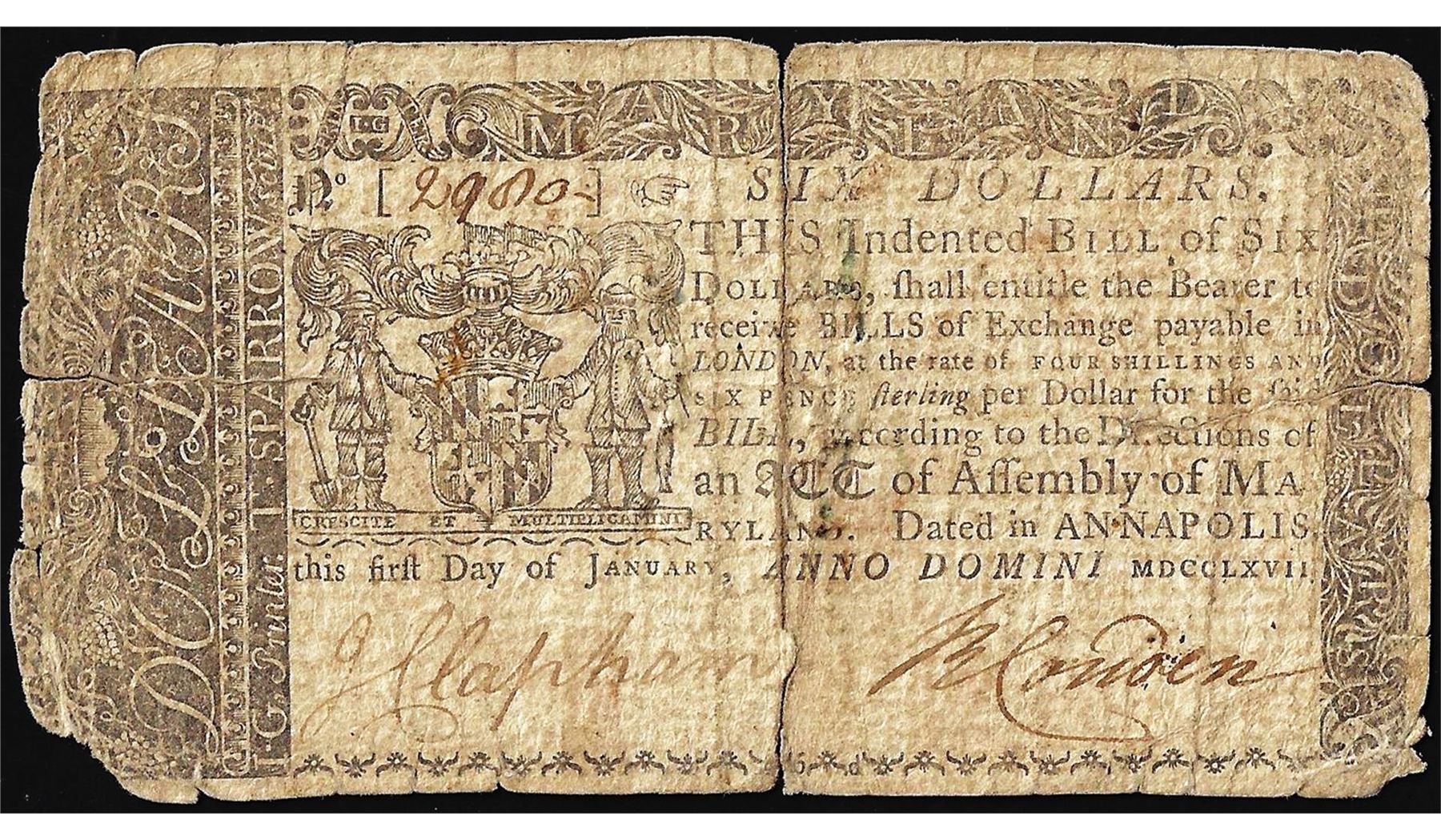 One January 1, 1767 $6 Maryland Colonial Currency Note.