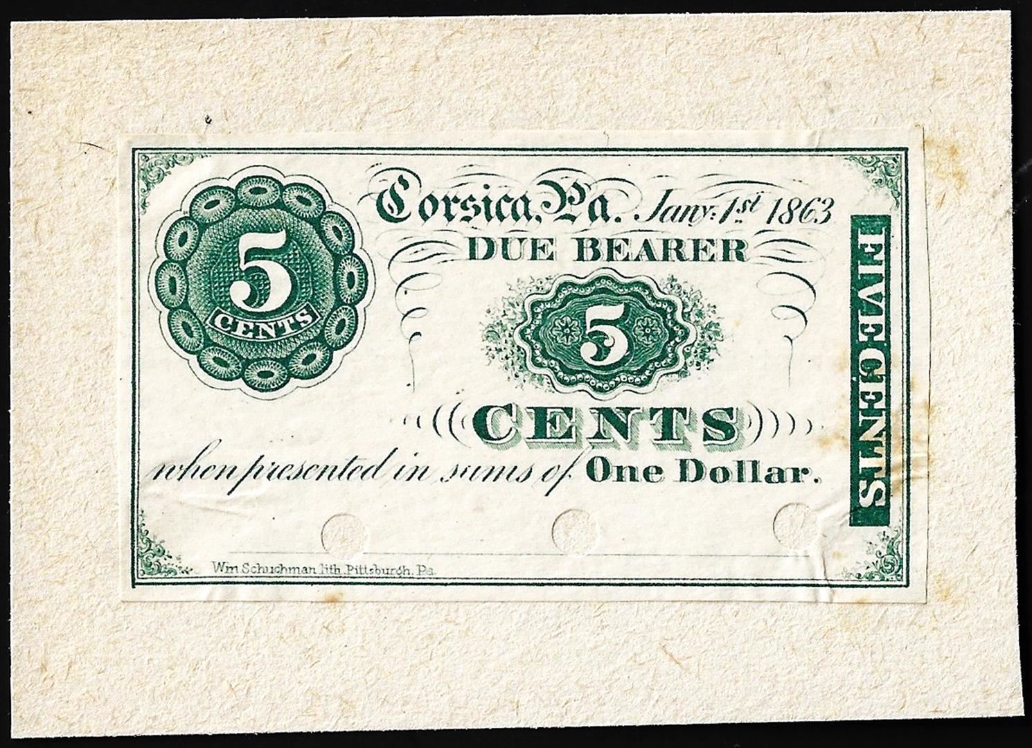 One January 1, 1863 Five Cents Corisca, Pennsylvania Obsolete Scrip Note.