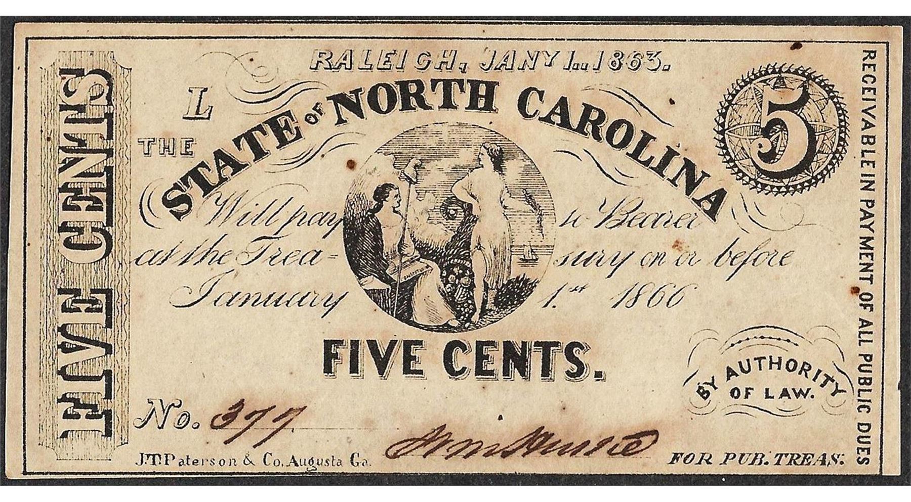 One January 1, 1863 Five Cents State of North Carolina Obsolete Note.