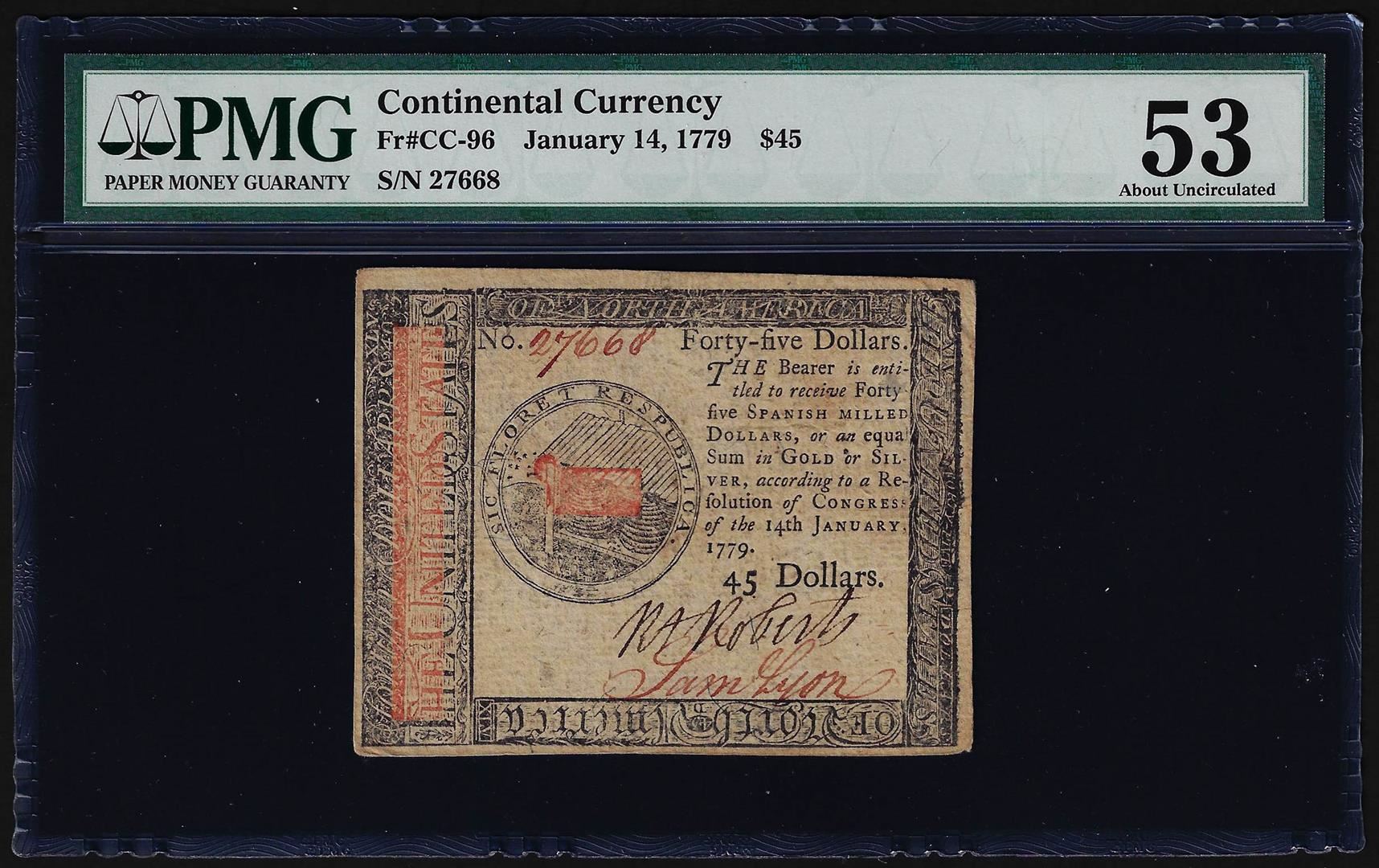 One January 14, 1779 $45 Continental Currency Note PMG About Uncirculated 53. PMG Certified.
