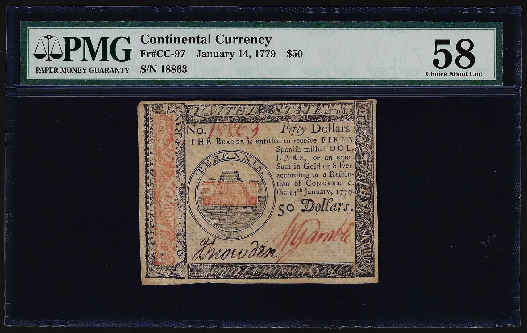 January 14, 1779 $50 Continental Currency Note PMG Choice About Uncirculated 58