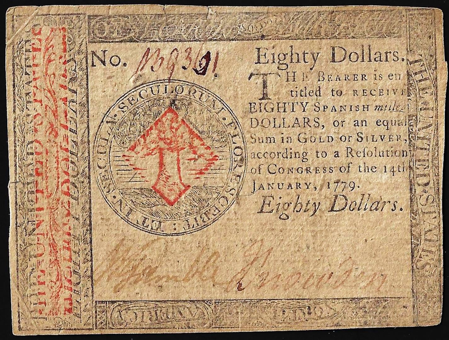 One January 14, 1779 $80 Continental Currency Note.
