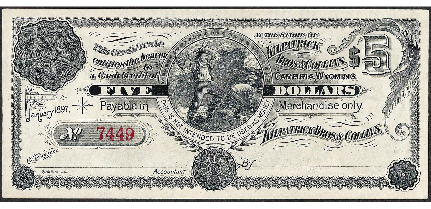 One January 1897 $5 Kilpatrick Bros & Collins Obsolete Scrip Note.