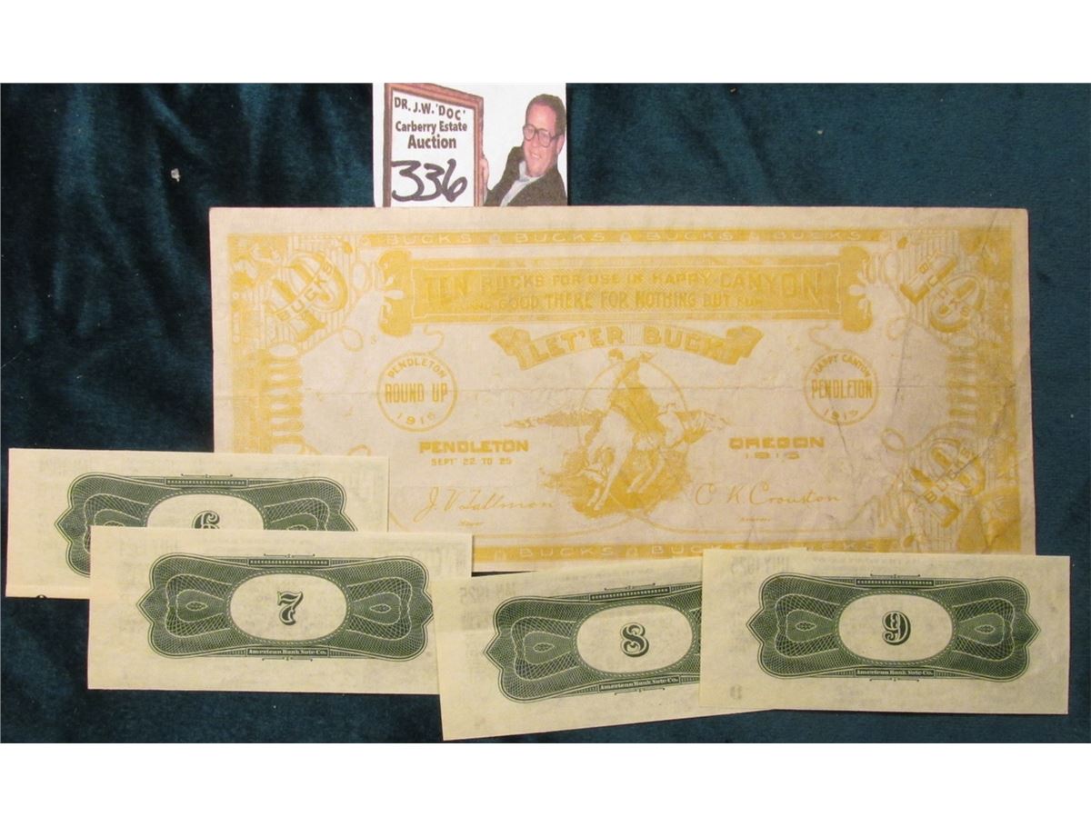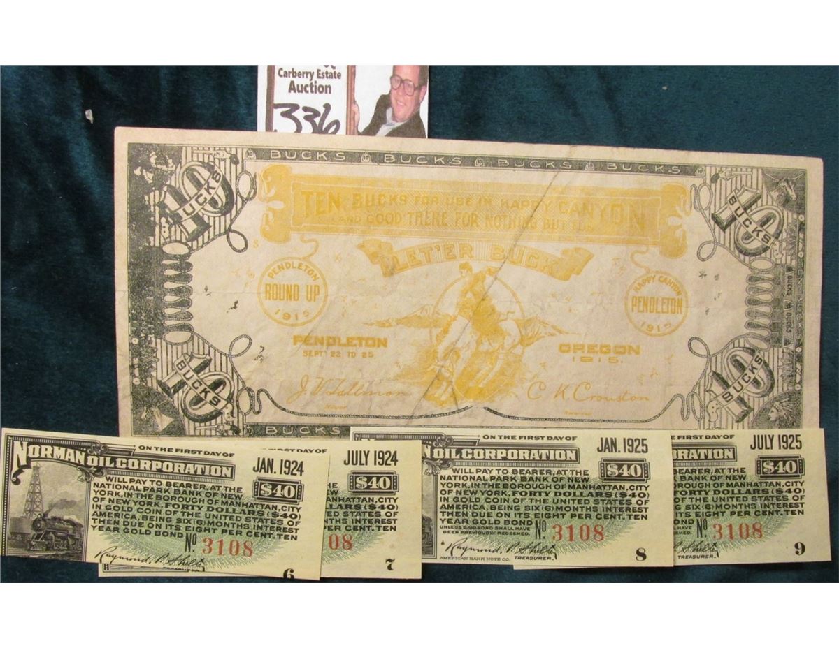 January 1924, & July 1924, January 1925, & July 1925"Norman Oil Corporation Will Pay to Bearer…$40", Ticket stubs, depicting Oil derrick and locomotive; & 1915 Pendleton, Ore. Scrip.