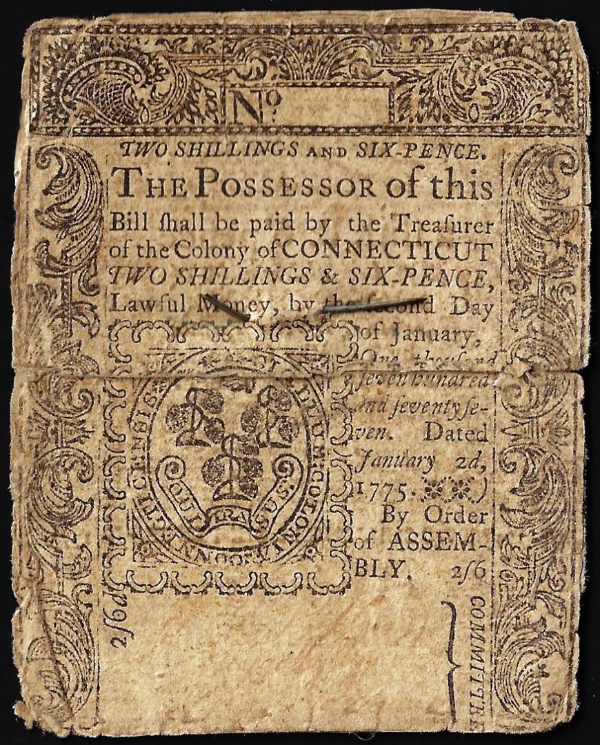One January 2, 1775 Two Shillings & Six Pence Connecticut Colonial Currency Note.