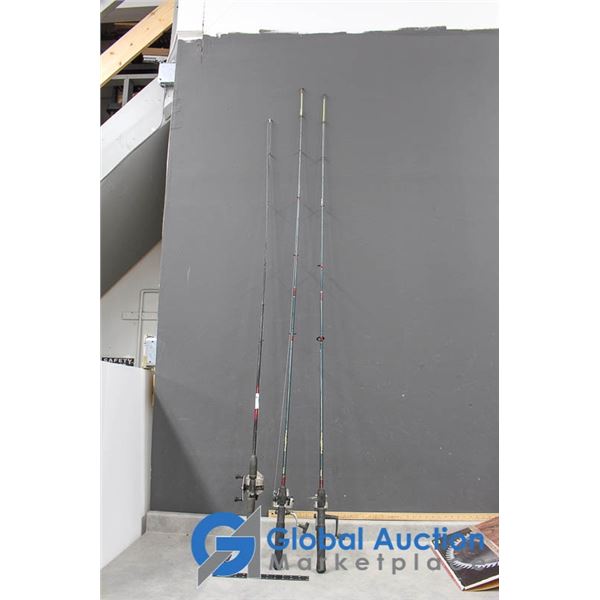 **(3) Fibreglass Fishing Rods w/Reels - 2 Open, 1 Closed