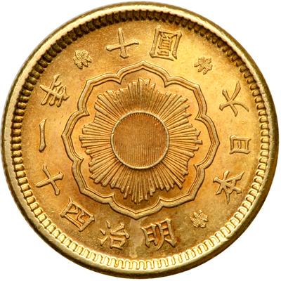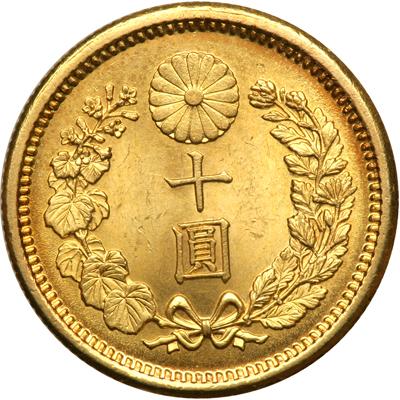 Japan. 10 Yen, 1908. Fr-51; KM-Y33. Meiji-41. Mutsuhito, 1867-1912. Radiant sun. Reverse: Value in wreath. NGC graded MS-64.