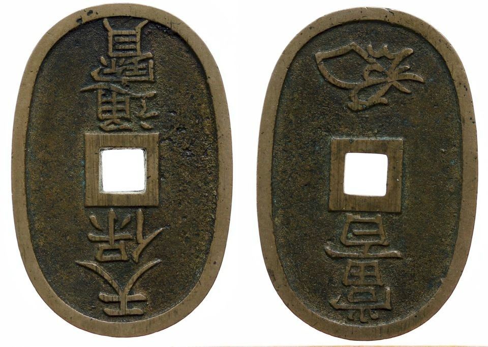 Japan; 100 mon 1835-1870, Large Bronze coin, "Tenpōtsūhō", C#7. 22.30 grams, 48.6 mm by 32.2 mm.