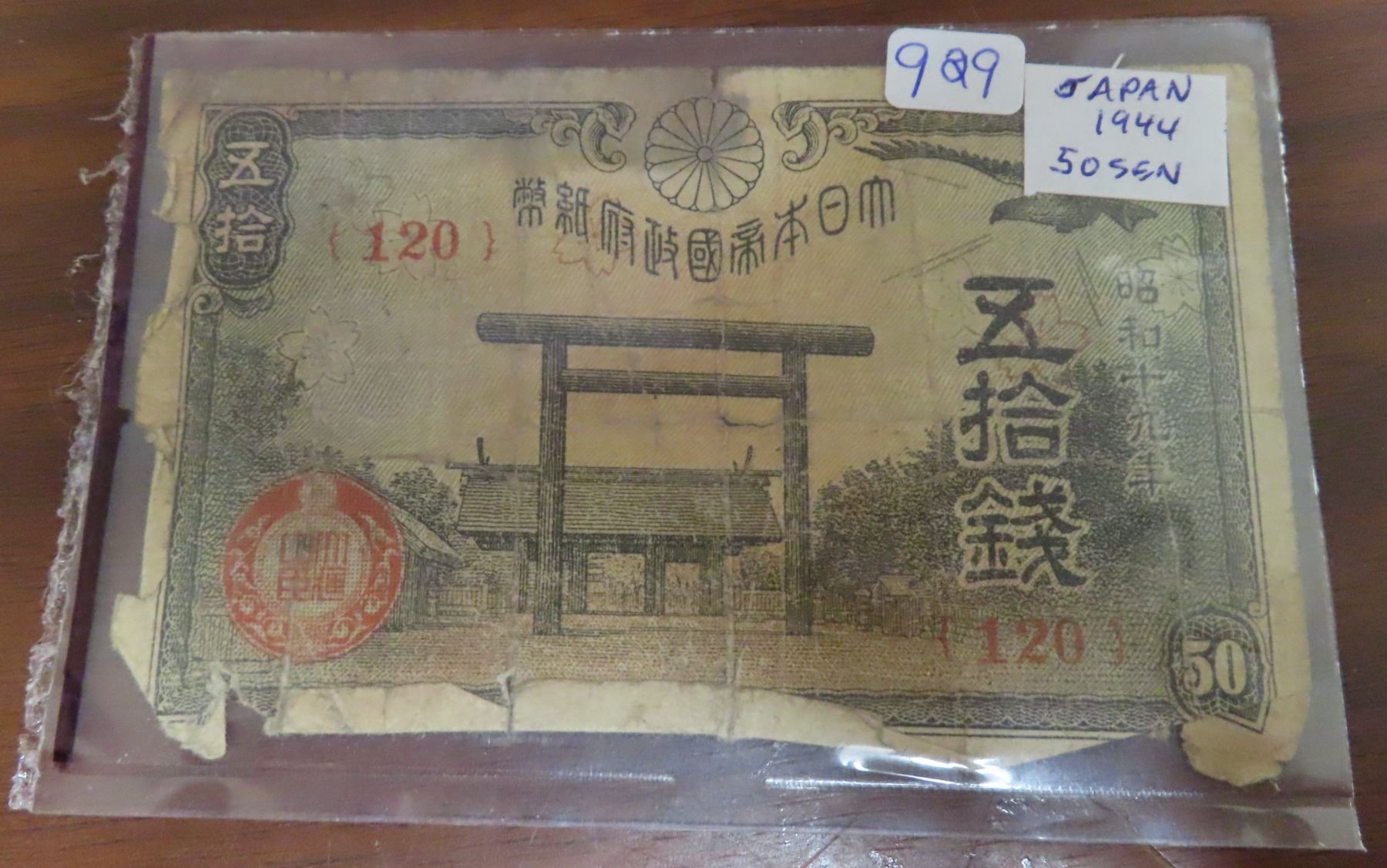 Japan. 1944 50 Sen. Issued during World War II. Good.