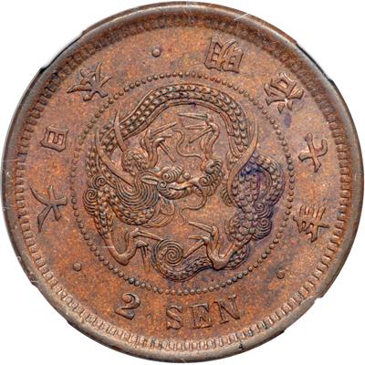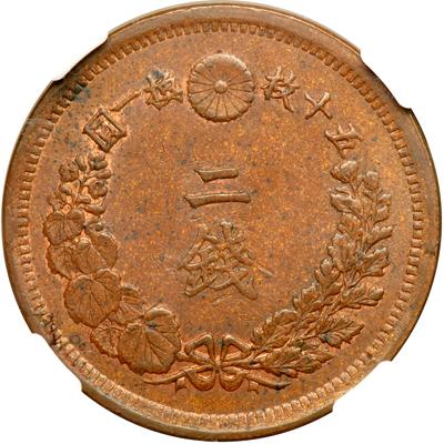 Japan. 2 Sen, 1874. KM-Y18.1. Meiji-7. Scarce date and very difficult to locate in top grade. In a new NGC 4 prong holder. NGC graded MS-62 Brown.