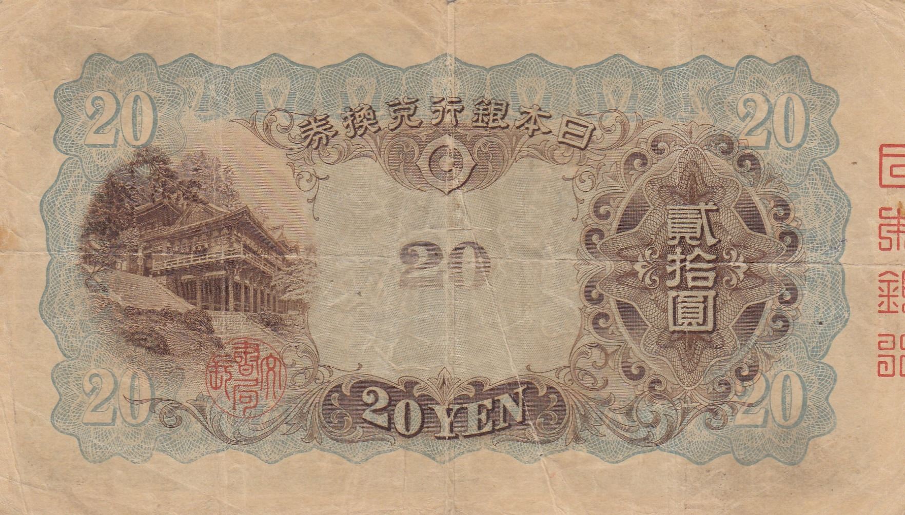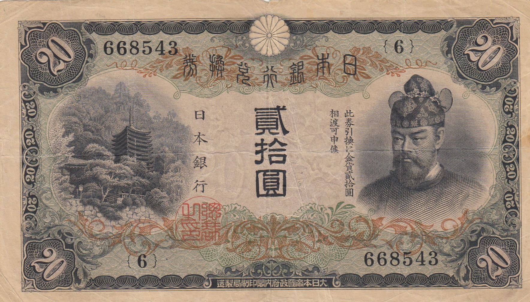 Japan, 20 Yen, 1931, VF, p41br/Mo-hin portrait, serial number: 6-668543