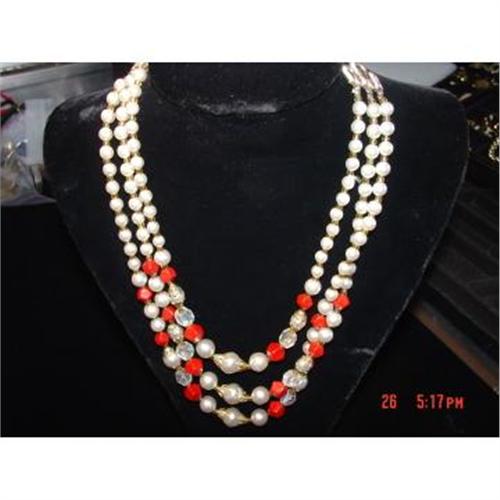 Here is a signed Japan 3 strand necklace. This is very attractive. There are pearl color beads alternating with red glass beads and crystal faceted glass beads. In between them are tiny amber color glass beads and brass type spacers. Excellent condition. This is 19 inches long