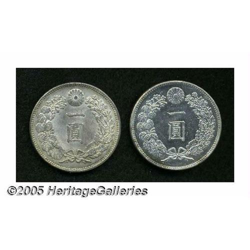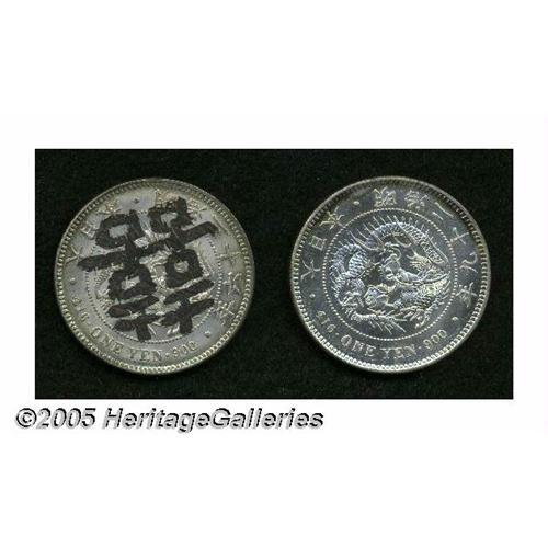 <B>A pair of 1 Yen as follows</B></I> Meiji 29 (1896), Choice AU with a prooflike reverse; and a Meiji 36 (1903), with 2 Chinese characters as ink chops on the obverse, "Double Luck and Double Happiness," Choice AU.