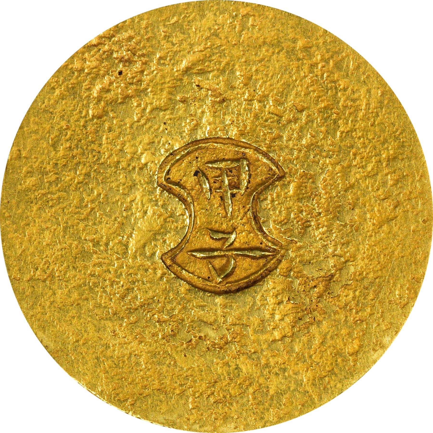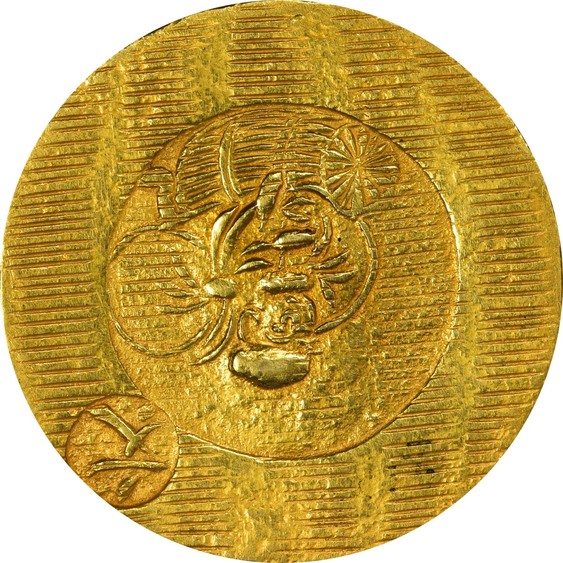 Famous Daikoku, god of fortune and weath, is on the obverse of this gold koban. The reverse are two characters pronounced "kinoene" which means woodrat, and stands for the first year of a 60-year cycle called the sexagenary cycle. (Gold 66.48%, Silver 32.14%) Weight 14.2g.