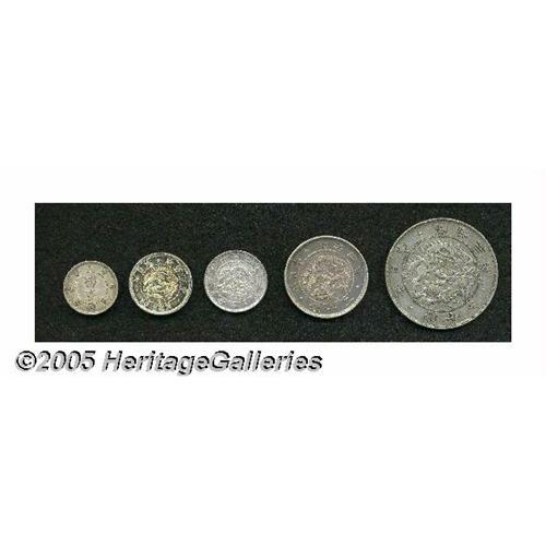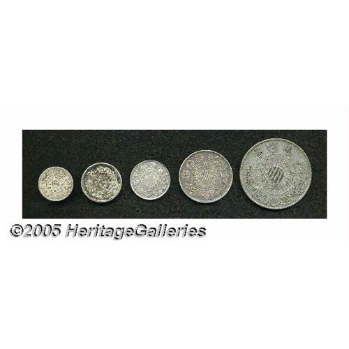 <B>Early Meiji types including:</B></I> Meiji 4 (1871) 5 Sen, KM-Y6.2, lustrous XF; Meiji 9 (1876) 10 Sen, Type 1, KM-Y23, toned AU/UNC; 10 Sen Meiji 3 (1870), Shallow Scales, KM-Y2, XF with rim cuts on both sides; 20 Sen Meiji 4 (1871), KM-Y3, XF with an obverse rim bump; and a 50 Sen Meiji 3 (1870), KM-Y4, VF. <B>A sold as is, no return lot.</B></I>