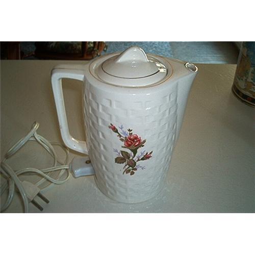 I am featuring a lovely Basketweave design teapot with pretty roses on both sides. Gold trim outlines the lid, rim and handle. The bottom is embossed: 120V-500W-JAPAN. Measurements are: 6 1/2 inches tall; Depth-5 1/2 inches; Base measures 3 1/2 inches in diameter.