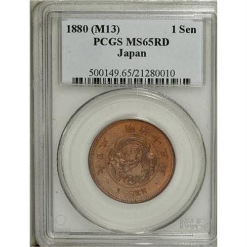 <B>Meiji 13 (1880) 1 Sen,</B></I> KM17.2, JNDA-1.46, MS65 Red PCGS. Fully struck and bright red with iridescent surfaces. Quite scarce in full mint-red color.<BR><BR><b>Shipping:</b> Coins & Currency (<a target="_blank" href="http://www.heritageauctions.com/common/shipping.php">view shipping information</a>)