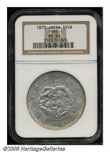 <B>Meiji 3 (1870) 1 Yen,</B></I> Type 1, KM-Y5.1, MS64 NGC. Lightly abraded with full luster and touches of golden toning.