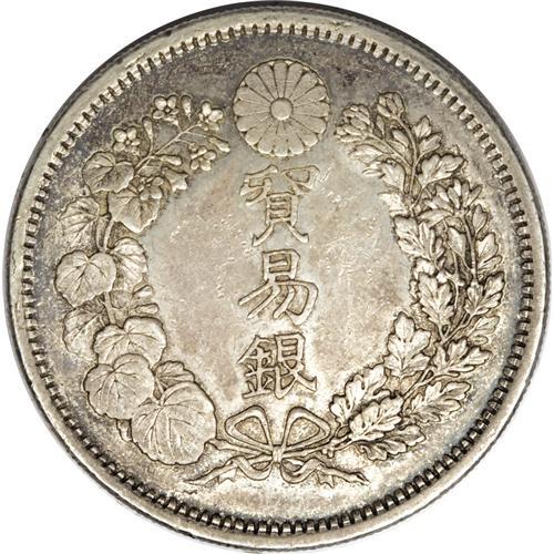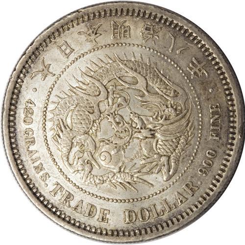<B>Meiji 8 (1875) Trade Dollar,</B></I> KM-Y14, JNDA-1.12, lustrous AU with obverse rim bumps.<BR><BR><b>Shipping:</b> Coins & Currency (<a target="_blank" href="http://www.heritageauctions.com/common/shipping.php">view shipping information</a>)