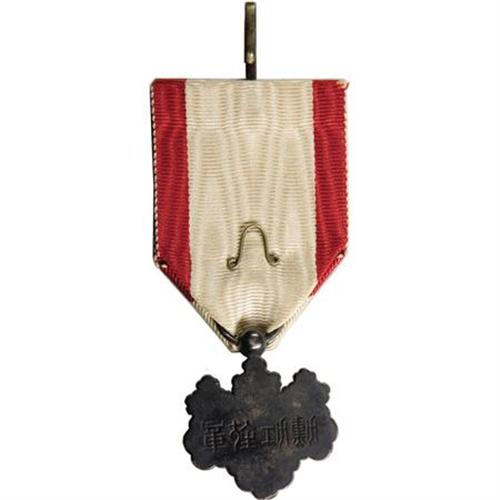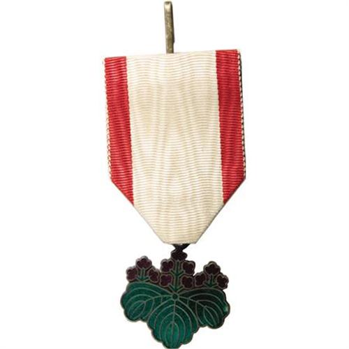 <B>Japan Order of the Rising Sun Medal, 7th Class.</B></I> The Order of the Rising Sun, which has been issued since 1875, is awarded to military personnel and civilians alike. This likely conflict-era badge has a metal hook contained in a white-centered ribbon with a red stripe to each side. From this hangs a silver medal in the shape of three paulownia leaves with pink and green enameling on the front and a series of characters on the back, presumably the name of the recipient. The enameling over the leaves distinguishes the 7th Class badge from the 8th Class badge, which is plain.<BR><BR><b>Shipping:</b> Coins & Currency (<a target="_blank" href="http://www.heritageauctions.com/common/shipping.php">view shipping information</a>)