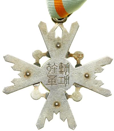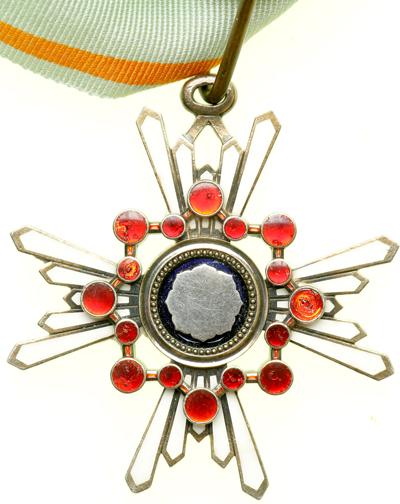 Japan. Order of the Sacred Treasure. Established 1888 in eight classes for civil or military merit. Third Class Neck Badge. A WW 2 issued specimen in gilt silver and enamels; 55mm wide by 57.5mm high. Werlich-776; Vernon-40 ($600). Several of the red "jewels" with enamel chips, all white enamel rays excellent. Replaced cravat loop with new full length neck cravat with hook and eye closure. Very Fine.
