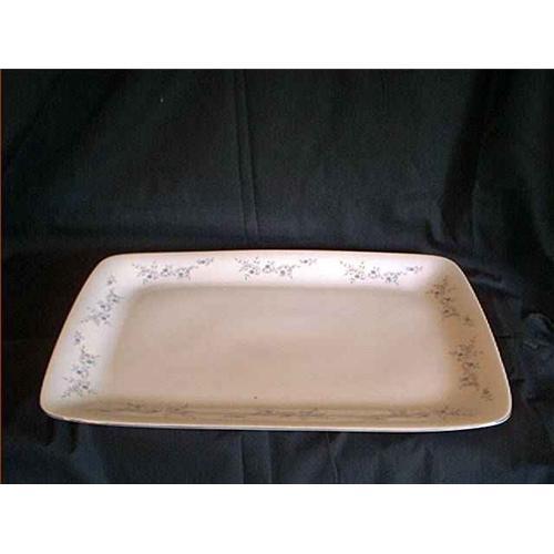 Platter or tray is large rectangular and is white with pretty blue and pink flowers. This platter is marked Modern China and Table Institute Inc. Japan Fine China Springtime 5722. The platter measures 11.75 inches wide and 17 inches long. It does have a small black fleck or speck but other than that it is in fine condition with no chips or cracks.