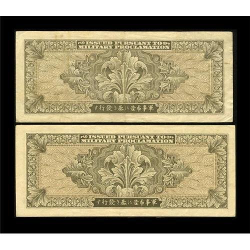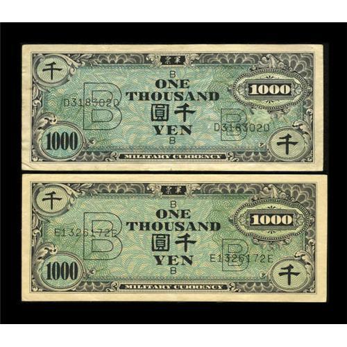 <B>Japan Supplemental B 1000 Yen Pick 76b Schwan-Boling 268d; e.</B></I><BR> The D-D block note was printed in 1955 and it grades <B>Fine </B></I>with a moisture spot above the right serial number. The E-E note was printed in 1956 and it grades <B>XF. </B></I>The 1000 Yen of this issue was printed by the Japan Ministry of Finance Printing Bureau without the BEP's authorization.<BR><BR><b>Shipping:</b> Coins & Currency (<a target="_blank" href="http://www.heritageauctions.com/common/shipping.php">view shipping information</a>)