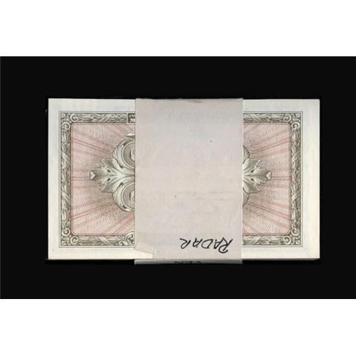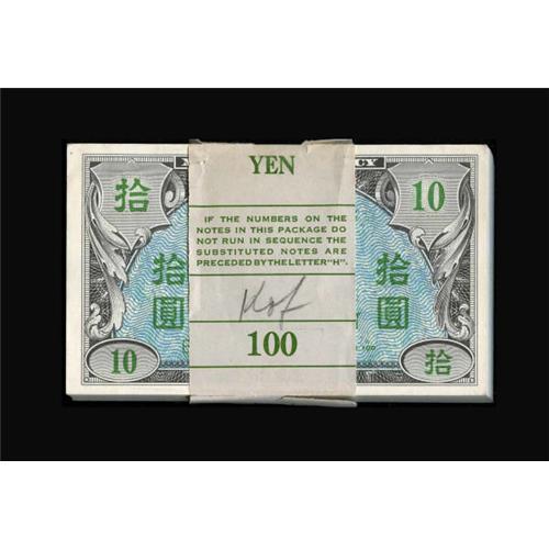 <B>Japan Supplemental B Ten Yen Original Pack of 100 with Radar Note Pick 71, Schwan-Boling 265.</B></I><BR> This pack has the palindrome serial number A06422460A note within its BEP band. It is unusual to find a radar for this issue, much less with its 99 other pack mates including the BEP band. Since the BEP band for this pack has been on active duty for 60 years, it is understandable that it shows wear, being taped at the top. <B>Choice New.</B></I><BR><BR><b>Shipping:</b> Coin/Currency (<a target="_blank" href="http://www.heritageauctions.com/common/shipping.php">view shipping information</a>)