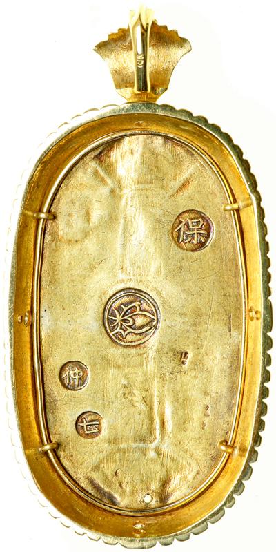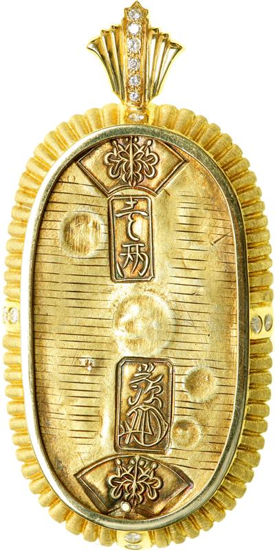 Japan. Tempo Koban ND (1837-1858). Fr-15; KM-22b. Mounted in a gold pendent with 13 small diamonds and a loop for suspension. Total weight with coin and diamonds 48.8 grams. Gold stamped 18 carat. Small hole at bottom of Koban. Coin, Very Fine.
