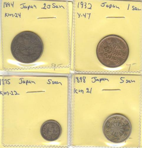Japan 1 Sen 1932 Y # 47, 5 Sen 1875 Y # A22, 5 Sen 1898 Y # 21 & 20 Sen 1894 Y # 24. Lot of 4 coins.