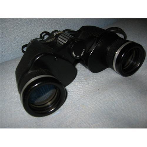 a powerful binocular Made in Japan marked and numbered. it has black leather case and very functional. the color is black with silver trims and accents and has a strong lense with black strap. the binocular is in excellent condition and the case in in fair condition. the binocular is 6 inch T. - 7 inch wide. each large lense is 1.5 inch in diam. each small lense is 1 inch in diam. the silver label reads Japan telescope passed the inspection.the knob reads made in Japan. on the lense one side has number 7-8-9-10-11-12-13-14-15. the other side has + 0 triangle symbol. large lense reads: FIELD 4(SYMBOL OF DEGREE) AT 15 POWER. other side reads: no. 3847 fully coated optics.. then on the body zoom 7x -15x35- J-B55- ON THE OTHER SIDE E-23. something to think about!