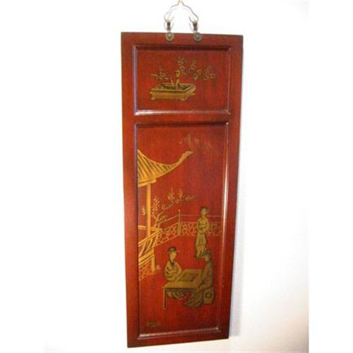 gorgious wood panel with japanese artist hand paint with gold and black, and is decorative with Japanese Scene. 34"T. - 12 " W. and 1 inch deep. prized for collectors!