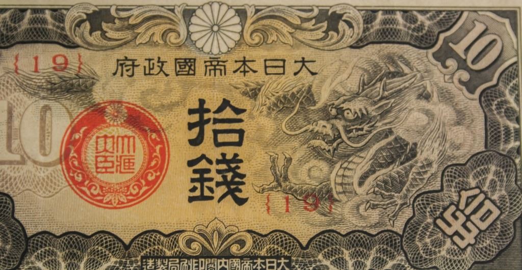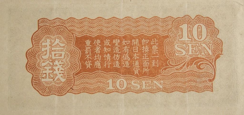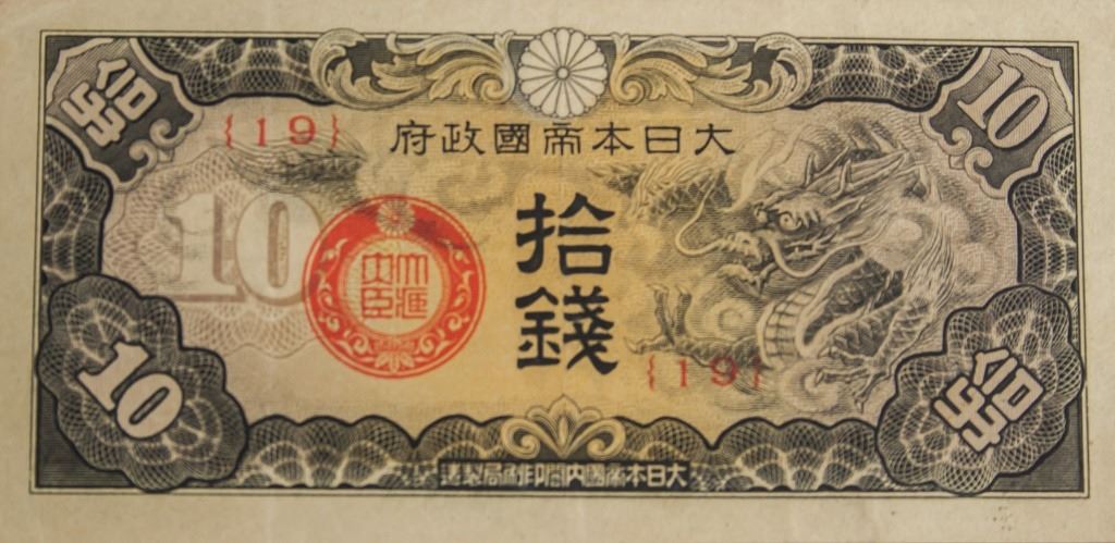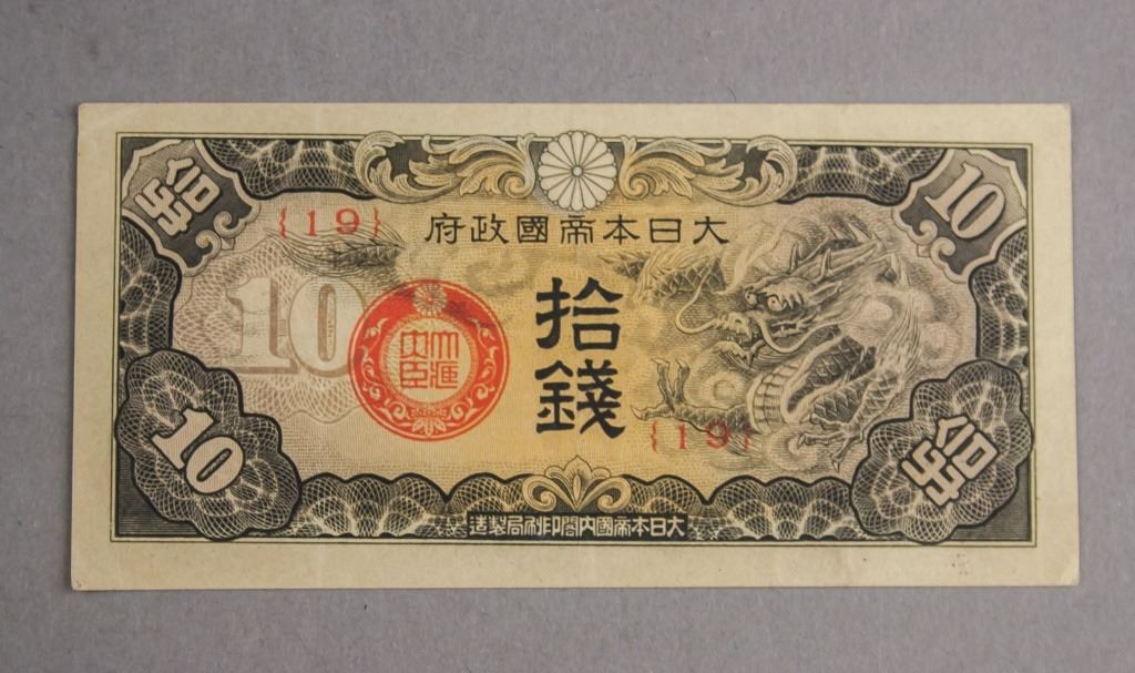 Japanese bill. Of denomination 10 Sen. With dragon to the right. Issued by the Japanese empire.