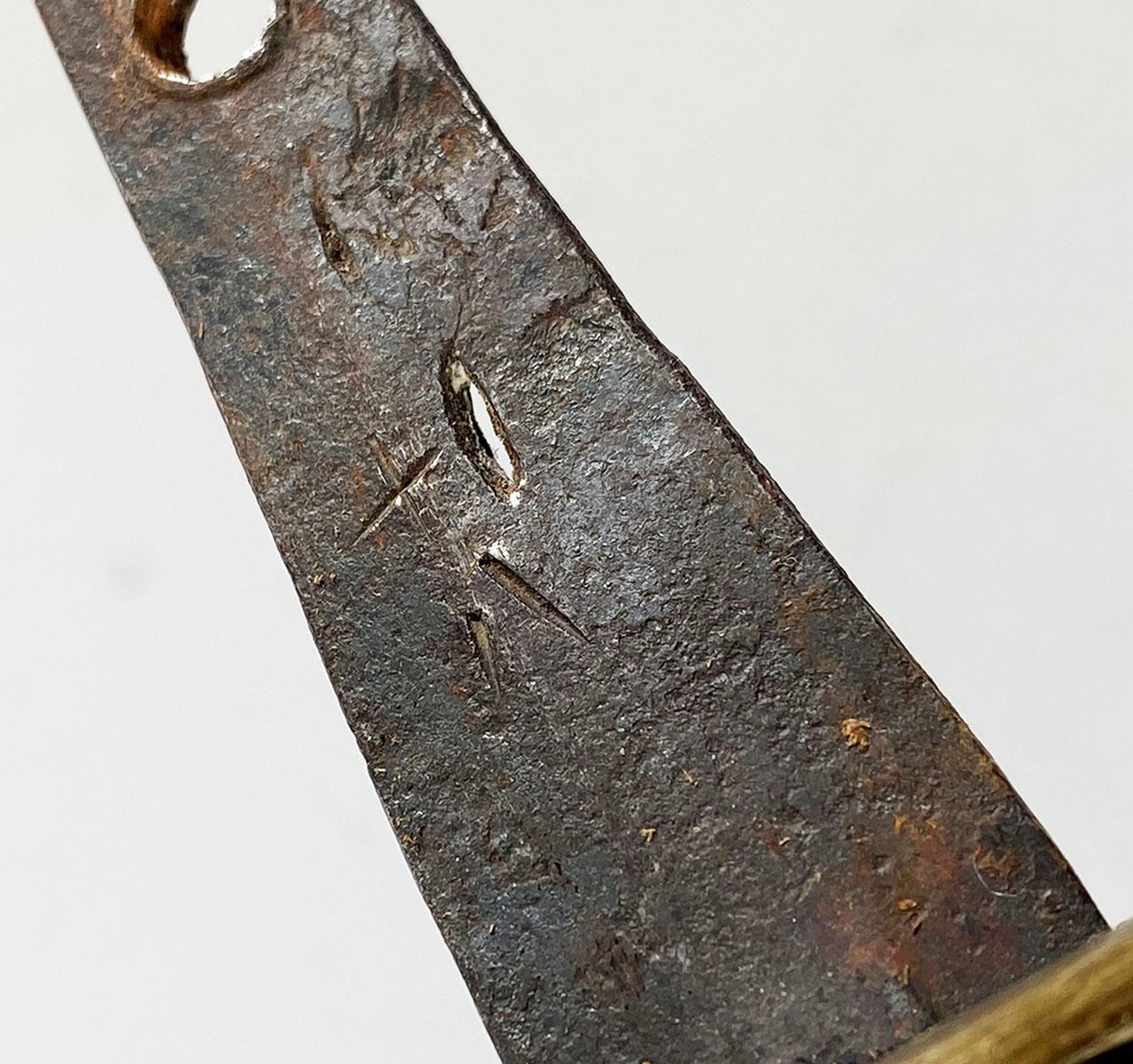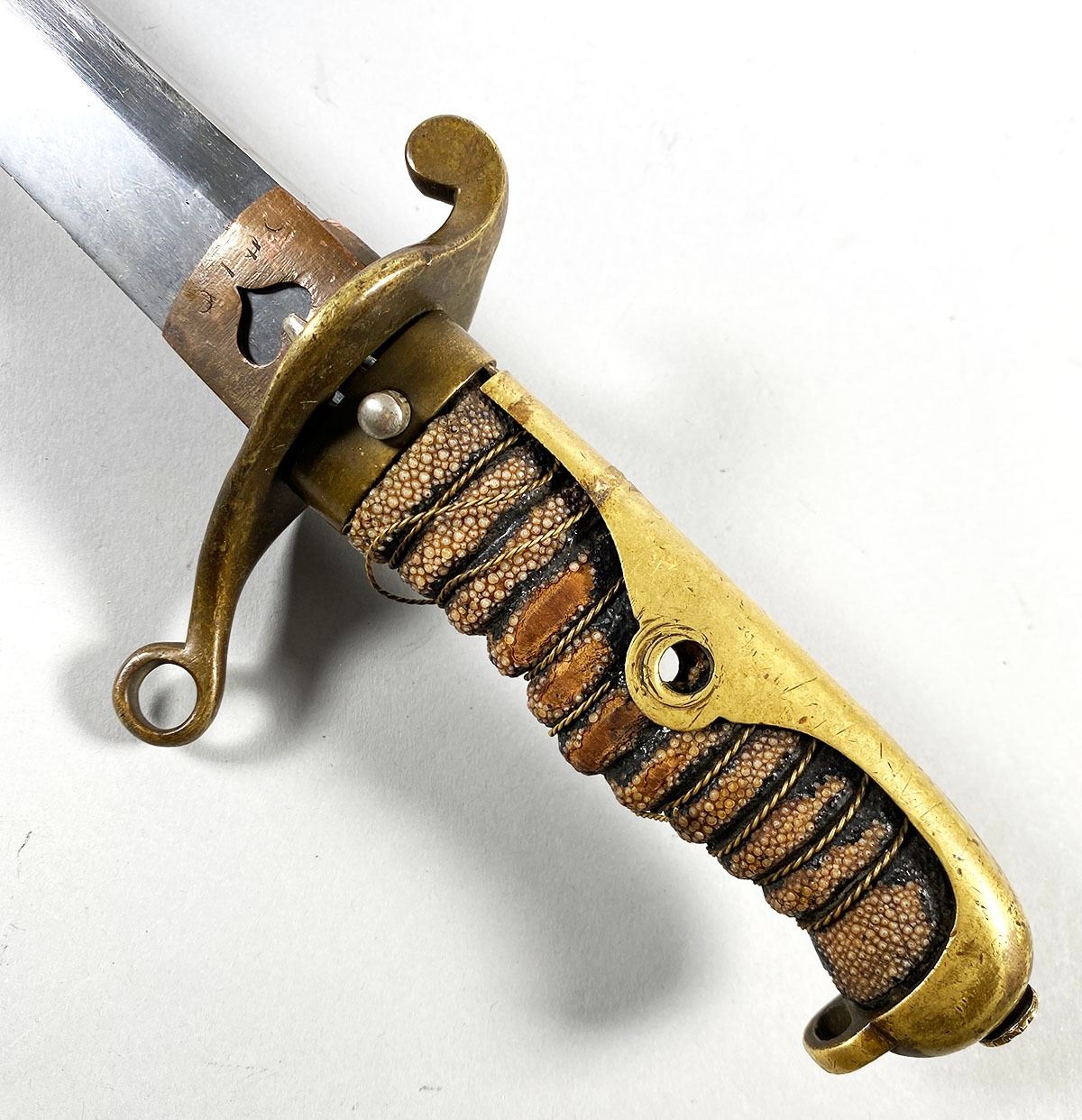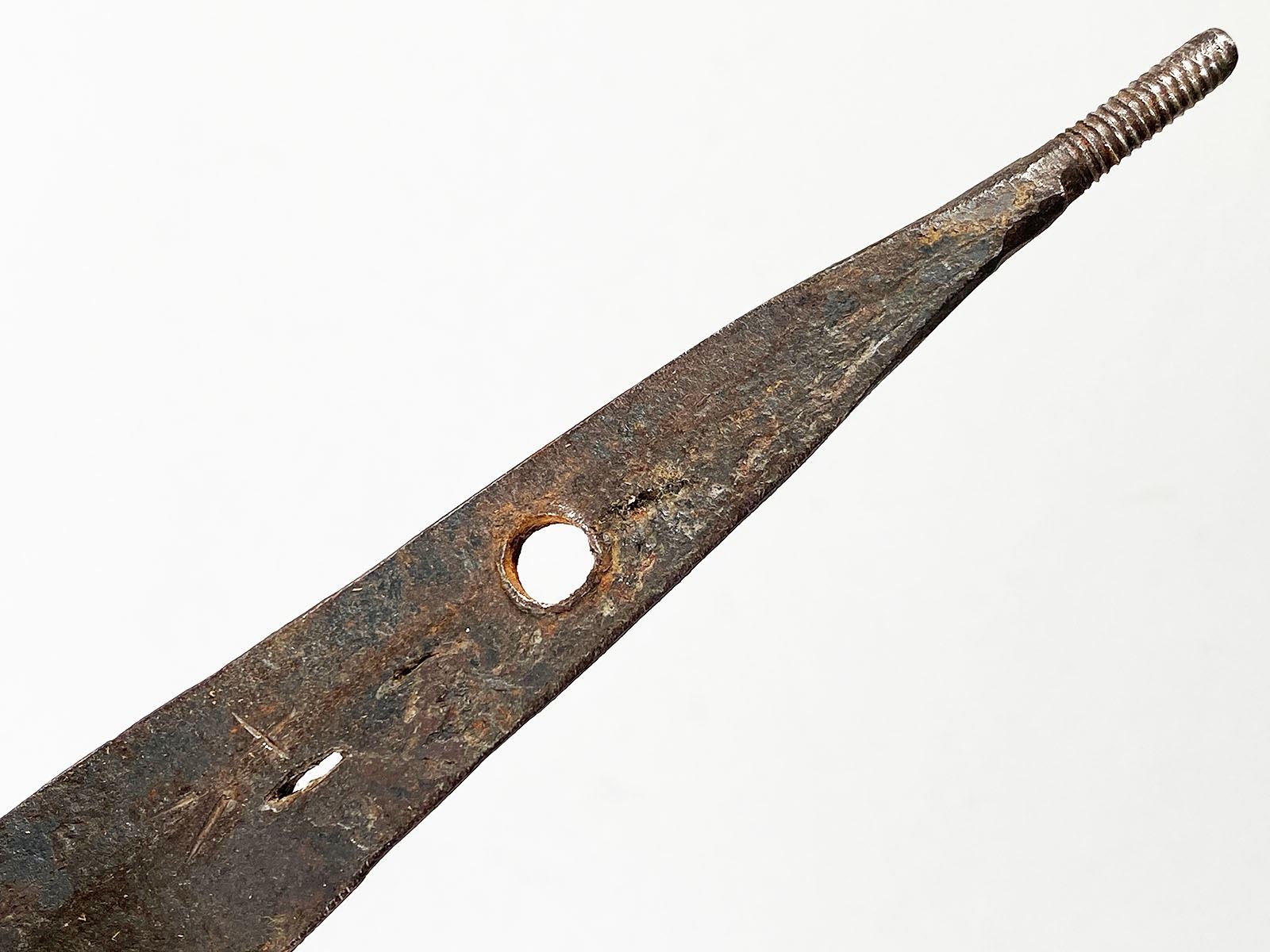 1400s Japanese Muromachi period uchigatana blade, 21-1/4" long to notch. Tang drilled and threaded for attachment to what appears to be navy kyu-gunto hardware. Worn shagreen grip with some wire detachment. See images for detail.