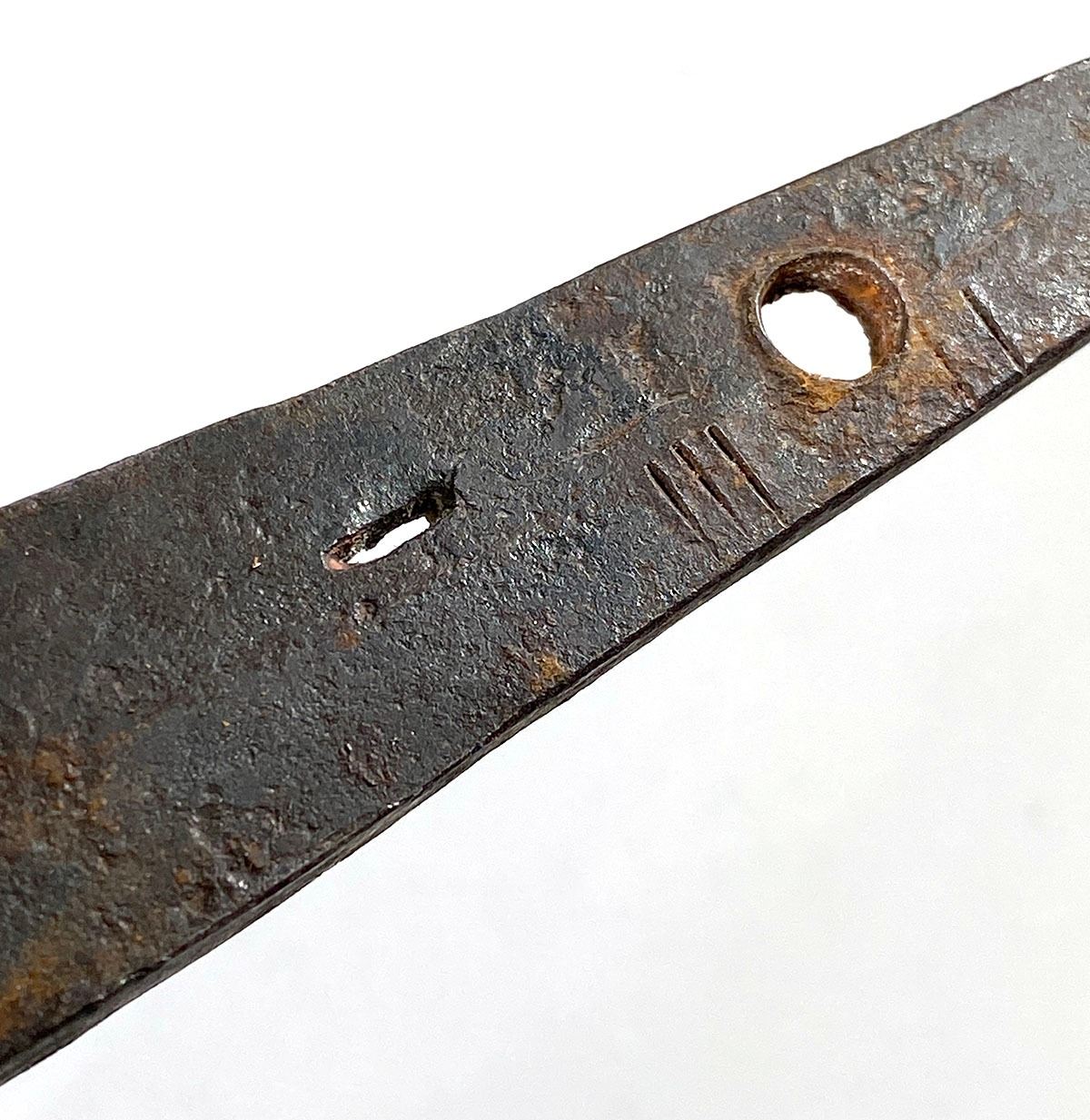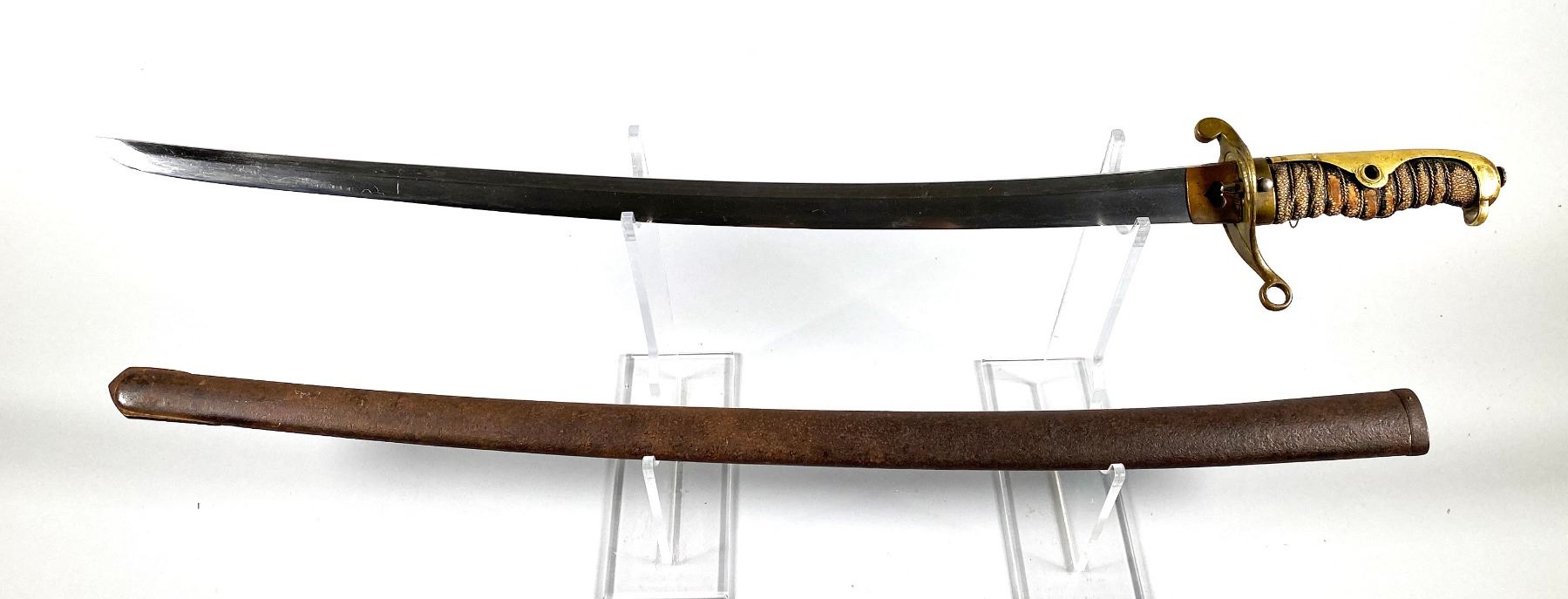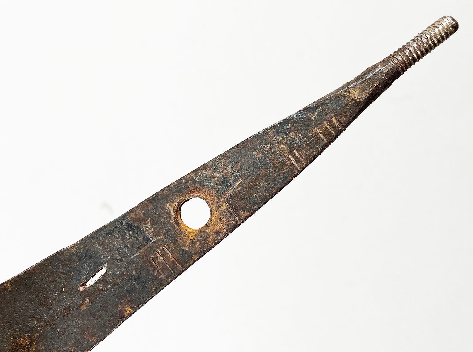 1400s Japanese Muromachi period uchigatana blade, 21-1/4" long to notch. Tang drilled and threaded for attachment to what appears to be navy kyu-gunto hardware. Worn shagreen grip with some wire detachment. See images for detail.