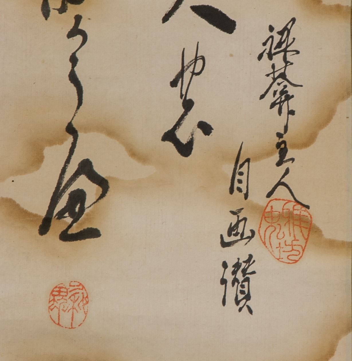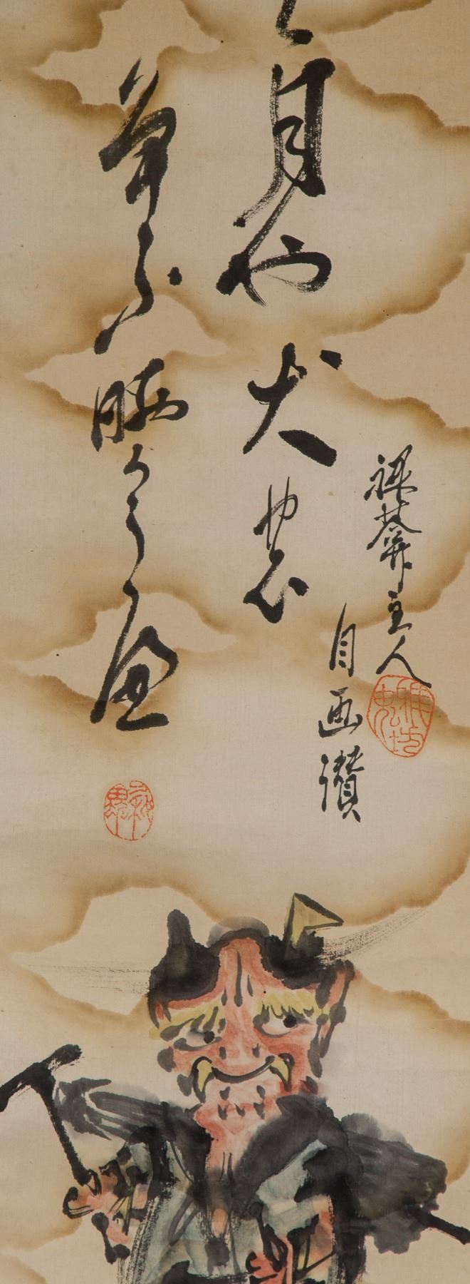 Painting of Raijin, thunder god; Japanese ink and watercolour on paper; hanging scroll; signed by artist; inscribed with 2 artist seals; 18th century; 70 x 16.5 cm.