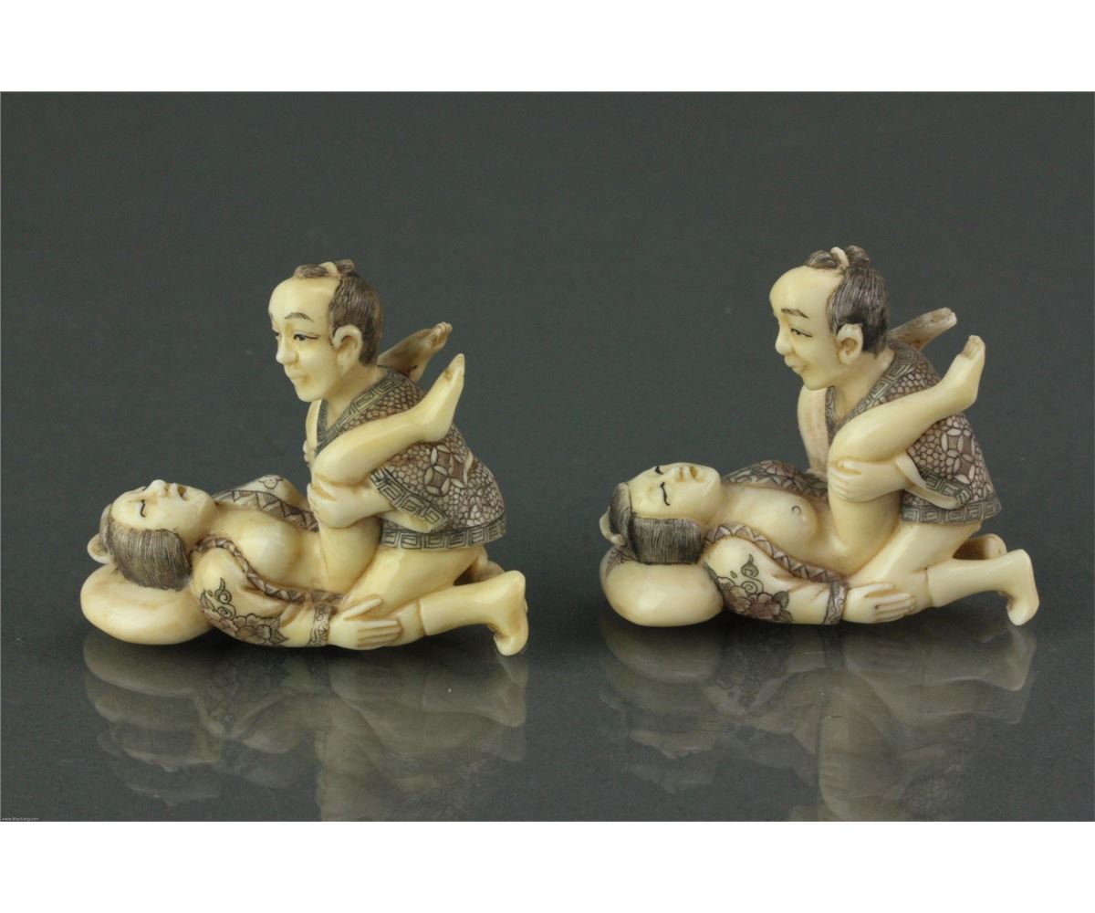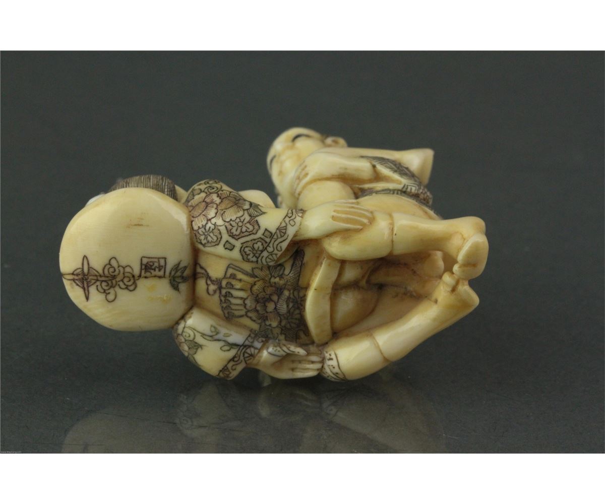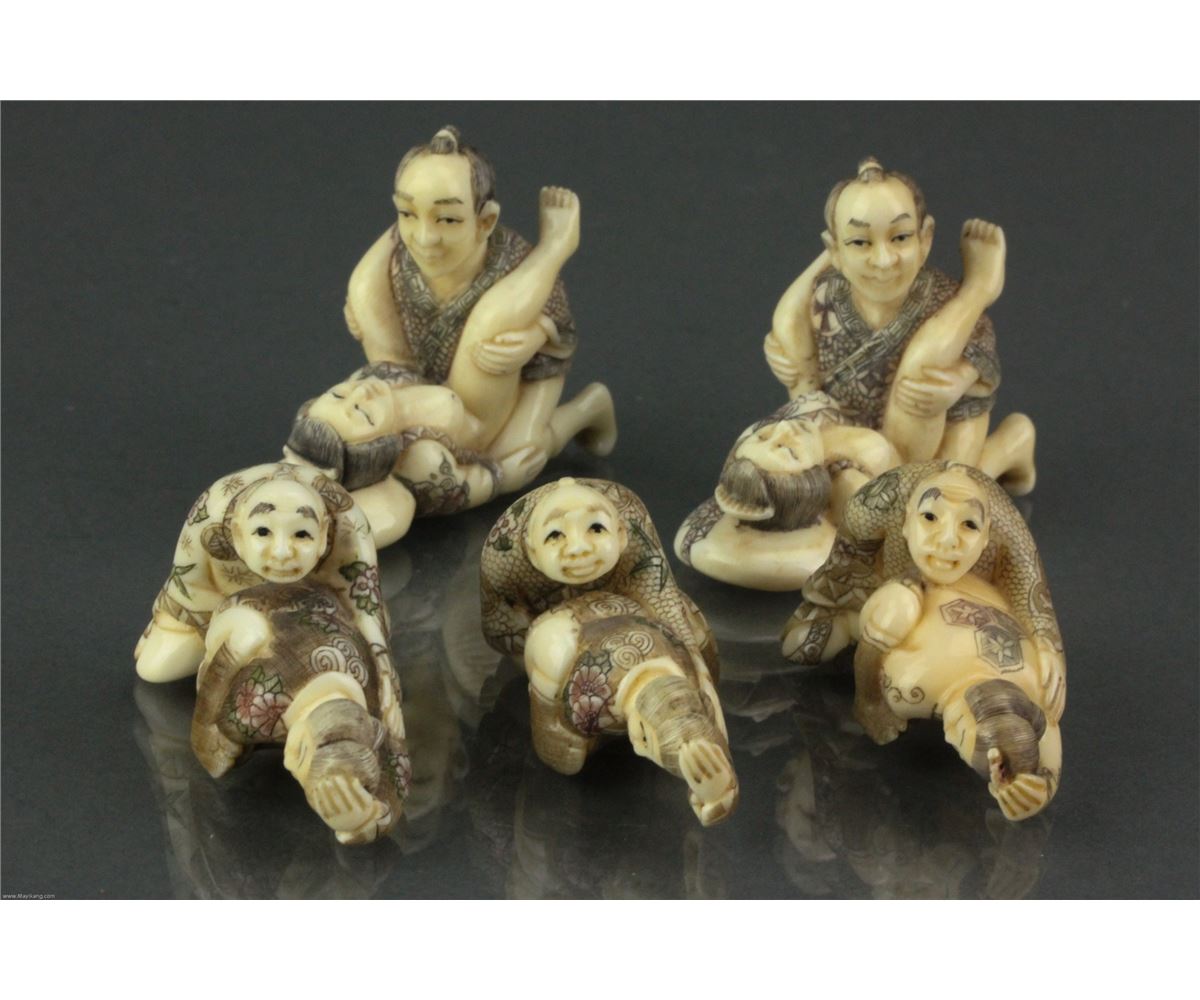 Five pieces of Chinese bone carved netsuke; featuring amorous couples; with two-character mark on base; L: 5 cm, W: 2.5 cm, H: 2 cm (each), 98 grams (total)