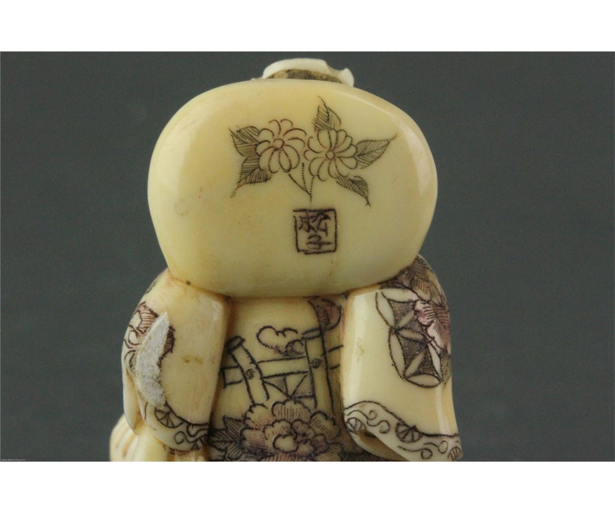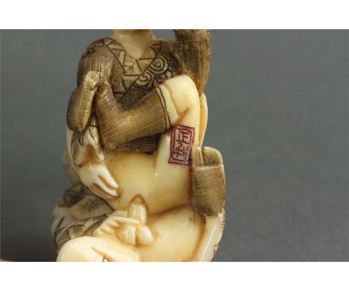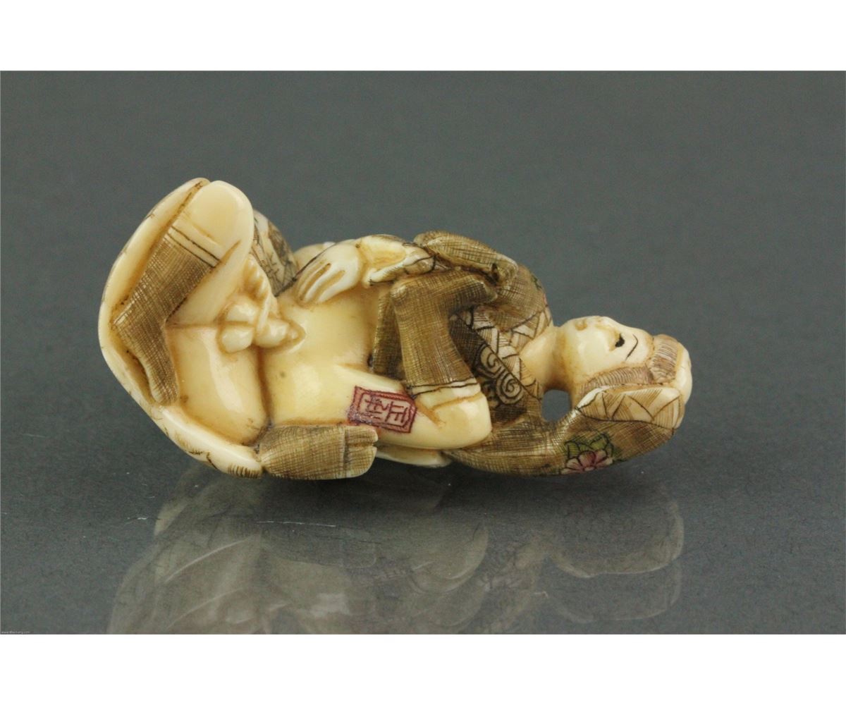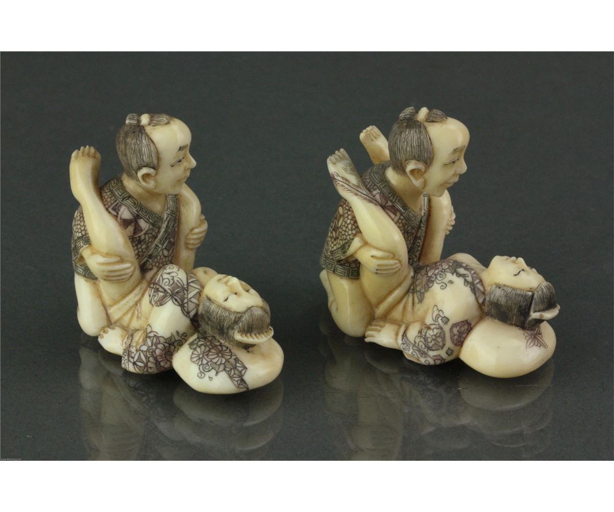 Five pieces of Chinese bone carved netsuke; featuring amorous couples; with two-character mark on base; L: 5 cm, W: 2.5 cm, H: 2 cm (each), 98 grams (total)
