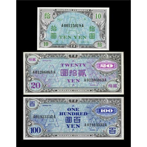 <B>Japanese A Yen Crisp Uncirculated or Better.</B></I><BR> This lot consists of a 10 Yen Pick 70; 20 Yen Pick 72 ; and 100 Yen Pick 74. The 20 and 100 Yen notes are scarce at the unc grade level.<BR><BR><b>Shipping:</b> Coins & Currency (<a target="_blank" href="http://www.heritageauctions.com/common/shipping.php">view shipping information</a>)