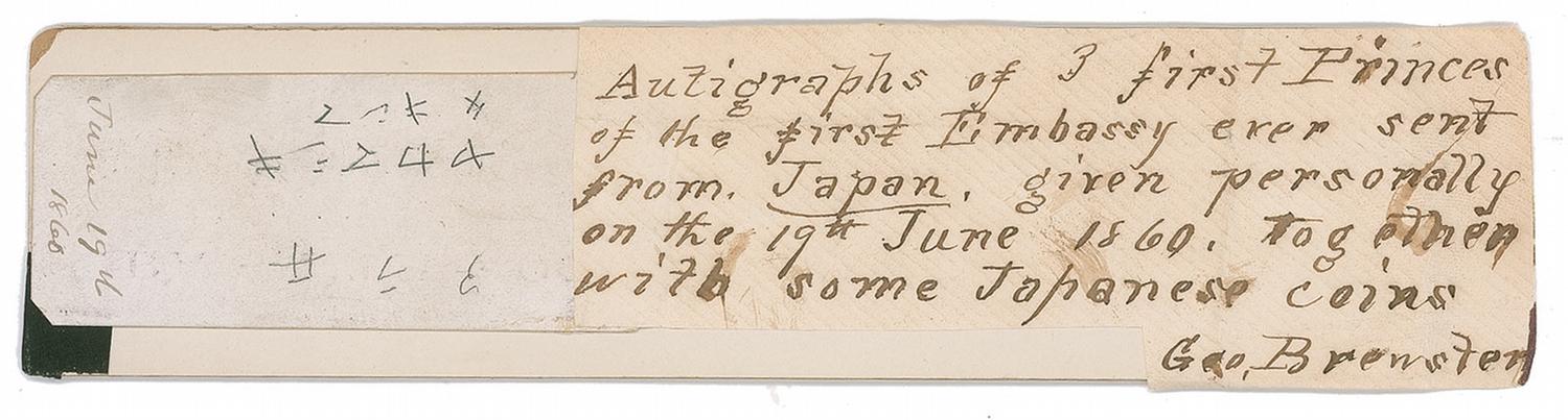 Pencil signatures, in Japanese, of the first three ambassadors to the United States: Masaoki, Norimasa, and Tadamasa on an off-white 1.5 x 3.5 card, dated at the bottom in an unknown hand June 19, 1860. Card is affixed to an 8 x 2 card, along with a note of provenance from George Brewster stating the signatures were “given personally on the 19th June 1860, together with some Japanese coins.” In fine condition, with scattered light toning.