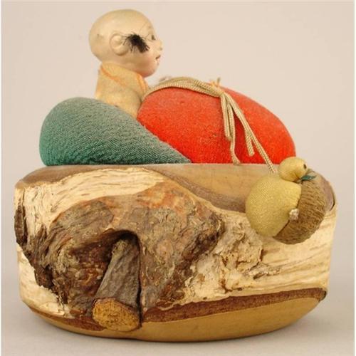 Unique and Beautiful Antique Japanese Pin Cushion made of Wood and Cloth, with Tree Bark and Knot Intact. This is a gorgeous, one-of-a-kind example of Japanese artistry delightfully employed in the creation of an everyday object. The little man and the duck are both charmingly rendered. Really a heart warming little piece of old Japan. Very Good Condition. 3.5 x 3.5 inches, 9 x 9 cm