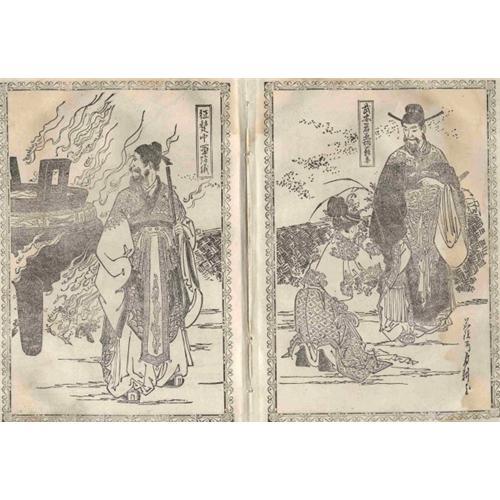 A Chronicle of China's Legendary Kingdom of Wuyue, published in 1887, with 50 original prints by Ogata Gekko, Japan's first internationally acclaimed artist. (Please visit the educational website, for more information on Gekko.) About half of the prints are 10x7 (25.4x18cm), and the other half are 5x7 (12.7x18cm). The cover is in Fair Condition, and the prints range from Fair to Fine Condition. This book was previously unknown and recently discovered in a collection in Japan, and is the only known existing copy. There is a dedication handwritten in the inside cover that is dated September 11, 1887!