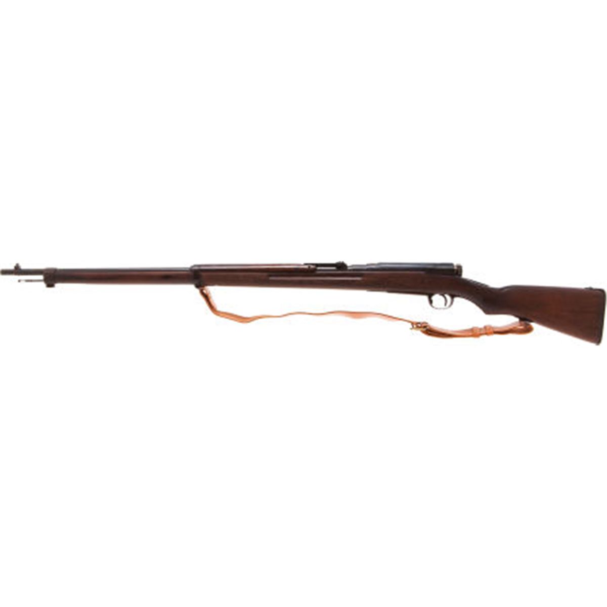 Japanese Arisaka Type 38 Bolt Action Rifle. Serial no. 510650, 6.5mm, 31 1/2-inch barrel with standard sights. Blued finish. 5-shot magazine. Steel action cover. Walnut stock and armguard. Sing mounts. Modern leather sling. Condition: Good as refurbished. Retaining approximately 70-75% reblued finish faded to brown and mixed with age patina. Ground mon. Wood with wear and bruises. Action good. Bore good. NRA FIREARMS FOR FREEDOM PROGRAM