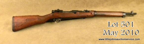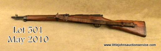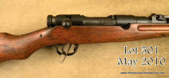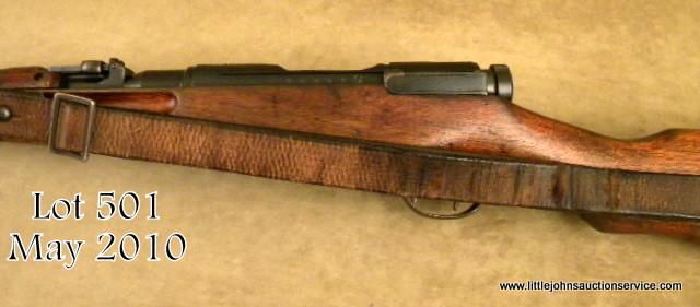 Japanese Arisaka Type 38 bolt-action carbine, 6.5mm cal., 19” barrel with bayonet lug at bottom of barrel band, military blue finish, metal cleaning rod, leather sling with two swivels, full length wood stock with two barrel bands, #40381with matching serial numbered bolt and floor plate. This gun is in overall very good condition showing approx. 75% original blue with the muzzle end of the barrel showing a dark plum colored patina and scattered light pitting; very goodbore, crisp action, sharp markings, ground mum, good Japanese characters; Nagoya Arsenal; wood stock is in overall very good condition with some scattered nicks and mars from carry and storage and the correct two-piece laminated butt stock.Est.: $175-$350.