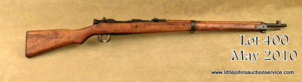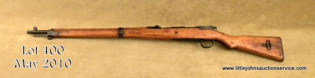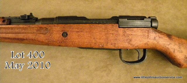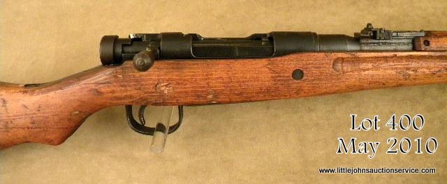 Japanese Arisaka Type 99 bolt-action short rifle, 7.7mm cal., 26” barrel with bayonet lug at bottom of barrel band, military blue finish, full length wood stock with two barrel bands, #57349 with matching serial numbered bolt. This gun is inoverall very good condition showing approx. 94% original military mat finish with ground mum, good Japanese characters remaining, Nagoya Arsenal marked; very good bore, crisp action, cleaning rod present, two sling swivels, steel butt plate,rear sight missing aircraft folding arms; wood stock is in overall good condition with some scattered nicks and mars with a dime sized compression on the right side of the stock just above the trigger guard and correct laminatedtwo-piece butt stock, no monopod. Est.: $200-$400.