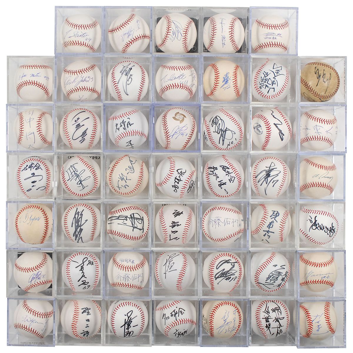 Collection of 48 signed baseballs, various makers and leagues, most signed in black felt tip (with some signed in blue ballpoint) on either the sweet spot or side panel. Signers include: four members of the 1965 Yomiuri Giants (Sadaharu Oh, Shigeo Nagashima, Masaichi Kaneda, and Isao Shibata), Hiromasa Arai, Takahiro Arai, Michio Arito, Masahiro Doi, Yutaka Enatsu, Kihachi Enomoto, Soichi Fujita, Tatsunori Hara, Isao Harimoto (2), Shigetoshi Hasegawa, Yoshinori Hirose, Kazuhisa Inao, Tetsuharu Kawakami, Sachio Kinugasa, Kimiyasu Kudo, Hideki Matsui (2), Kazuo Matsui, Daisuke Matsuzaka (4), Jiro Noguchi, Hideo Nomo, Katsuya Nomura, Michihiro Ogasawara, Takashi Saito, Yuki Saito, Keishi Suzuki, So Taguchi, Morimichi Takagi, Hitoshi Tamura, Masahiro Tanaka, Tsuyoshi Wada, Tsutomi Wakamatsu, Keiichi Yabu, Hisashi Yamada, Koji Yamamoto, Hiroyuki Yamazaki, Kenichi Yazawa, and Tetsuya Yoneda. In overall fine condition.